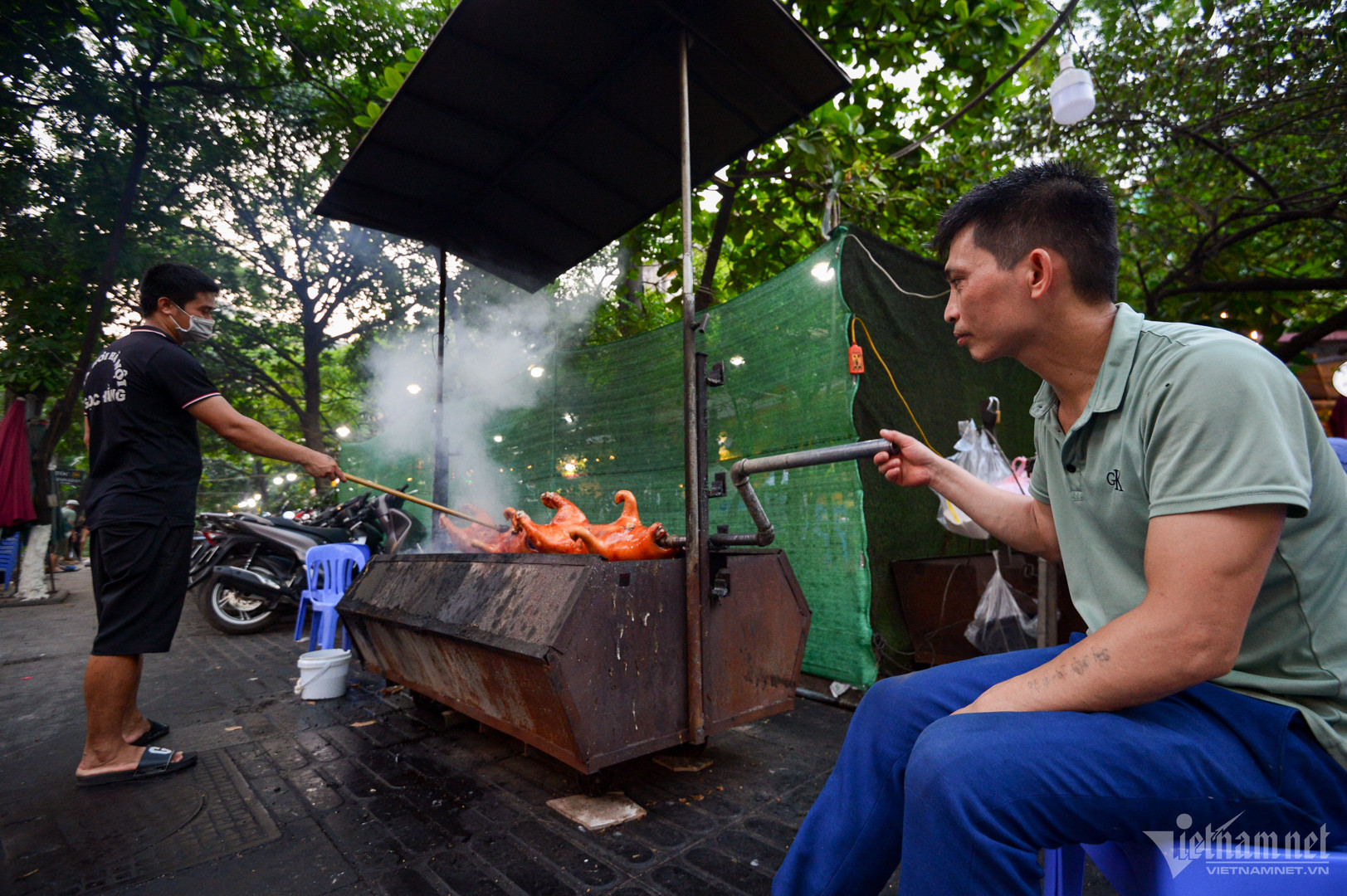 Anh Phan Văn Trọng ngồi quay lợn từ 15h. Nắng cộng với hơi nóng hừng hực bốc lên từ bếp than nhiều lúc khiến nam nhân viên không chịu nổi. "Nó phả vào mặt thực sự rất khó chịu, nhiều khi phải nhờ anh em vào thay để chạy ra ngoài dụi nước mắt", anh Trọng nói.