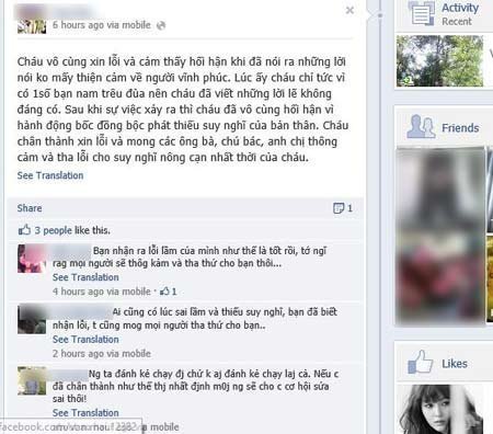 Ngày 17/1, trên trang cá nhân của mình, nữ sinh viết: “Cháu vô cùng xin lỗi và cảm thấy hối hận khi đã nói ra những lời nói không mấy thiện cảm về người Vĩnh Phúc. Lúc ấy cháu chỉ tức vì có một số bạn nam trêu đùa nên cháu đã viết những lời lẽ không đáng có.