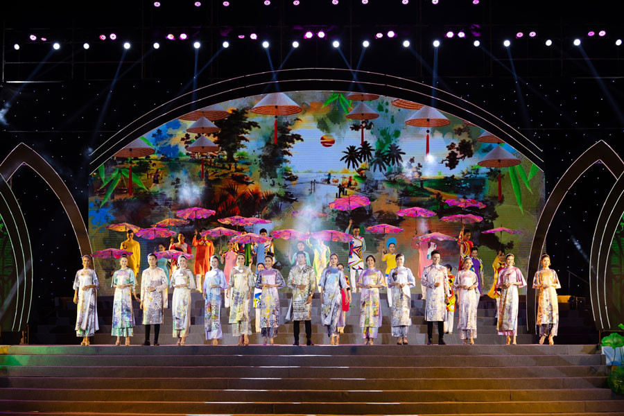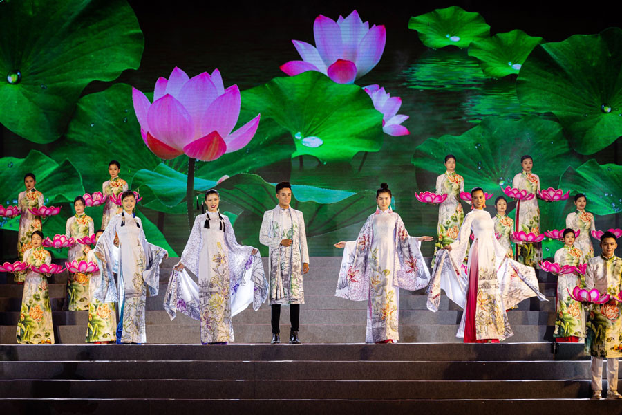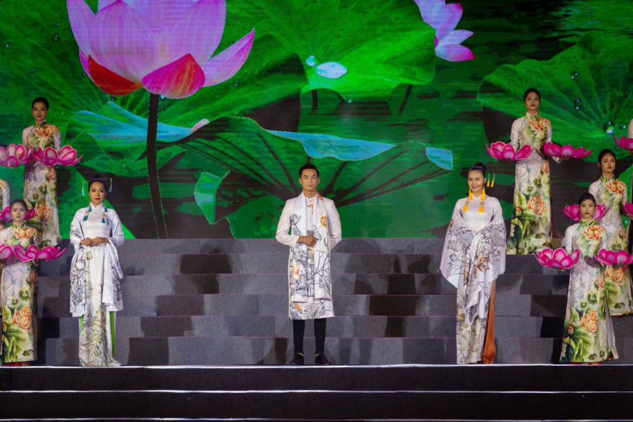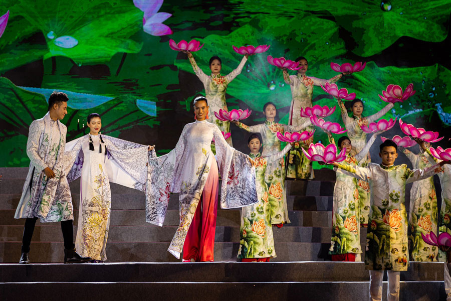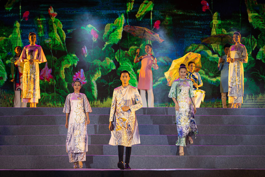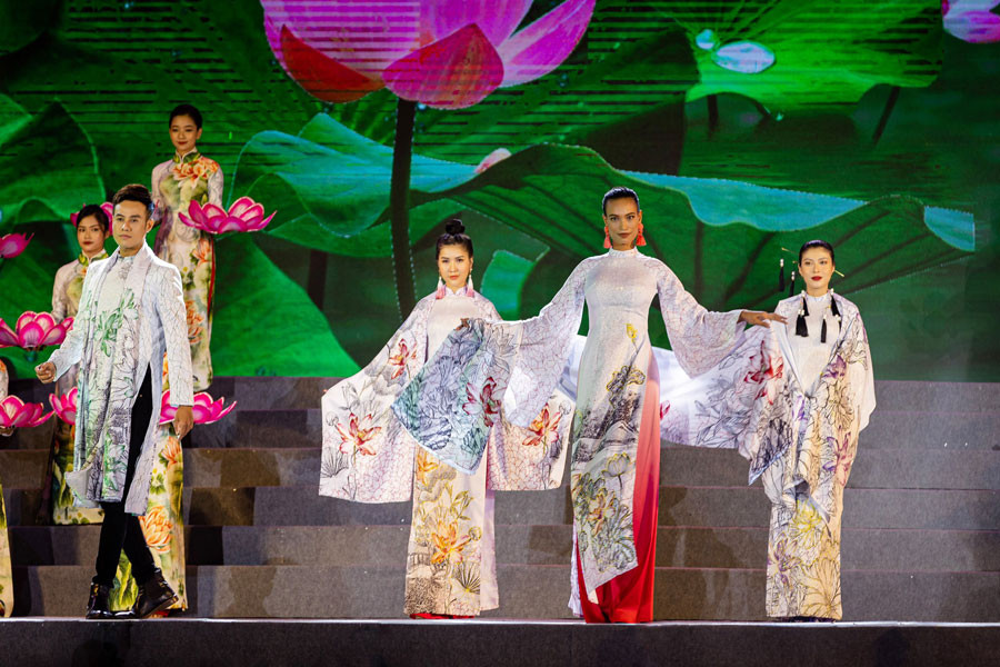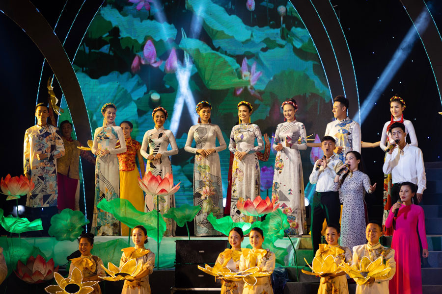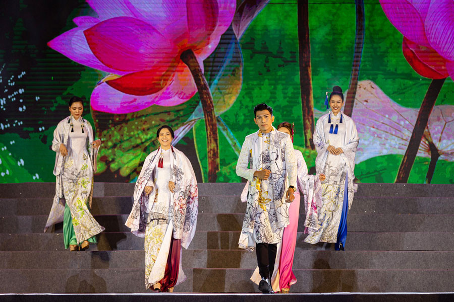 Hàng loạt nghệ sĩ tên tuổi đã có màn trình diễn trong các bộ sưu tập áo dài của nhà thiết kế Việt Hùng ở đêm bế mạc Lễ hội Làng Sen tại Nghệ An vào ngày sinh nhật Bác Hồ 19/5.