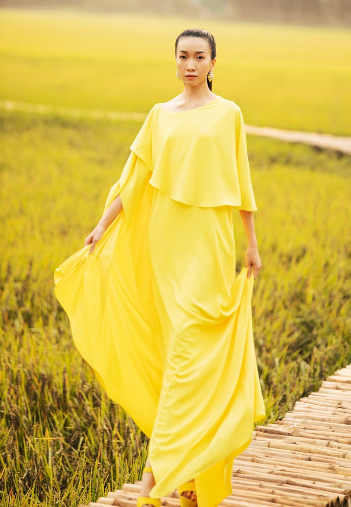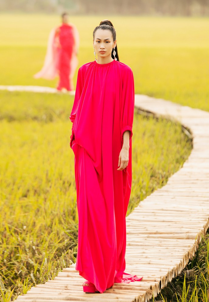 Những thiết kế đầu tiên được hé lộ có gam màu hồng chủ đạo, được các người mẫu trình diễn nổi bật trên cánh đồng lúa. Bên cạnh đó, các màu đỏ, vàng,… cũng xuất hiện trong BST lần này.