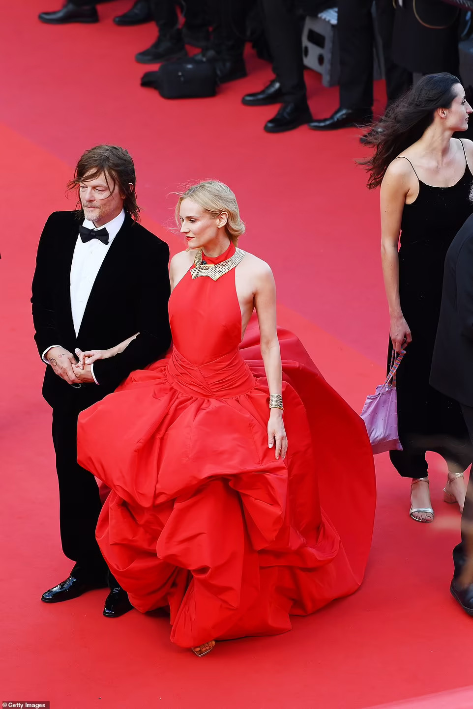 Trong khi đó nữ diễn viên Diane Kruger chọn đầm đỏ rực kết hợp vòng cổ và vòng tay bản lớn đến sự kiện.