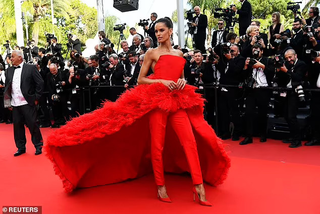 Izabel Goulart cũng chọn trang phục đỏ rực từ đầu đến chân. Cô mặc quần ống nhỏ cùng màu kết hợp với đầm xòe rộng được thiết kế lạ mắt.