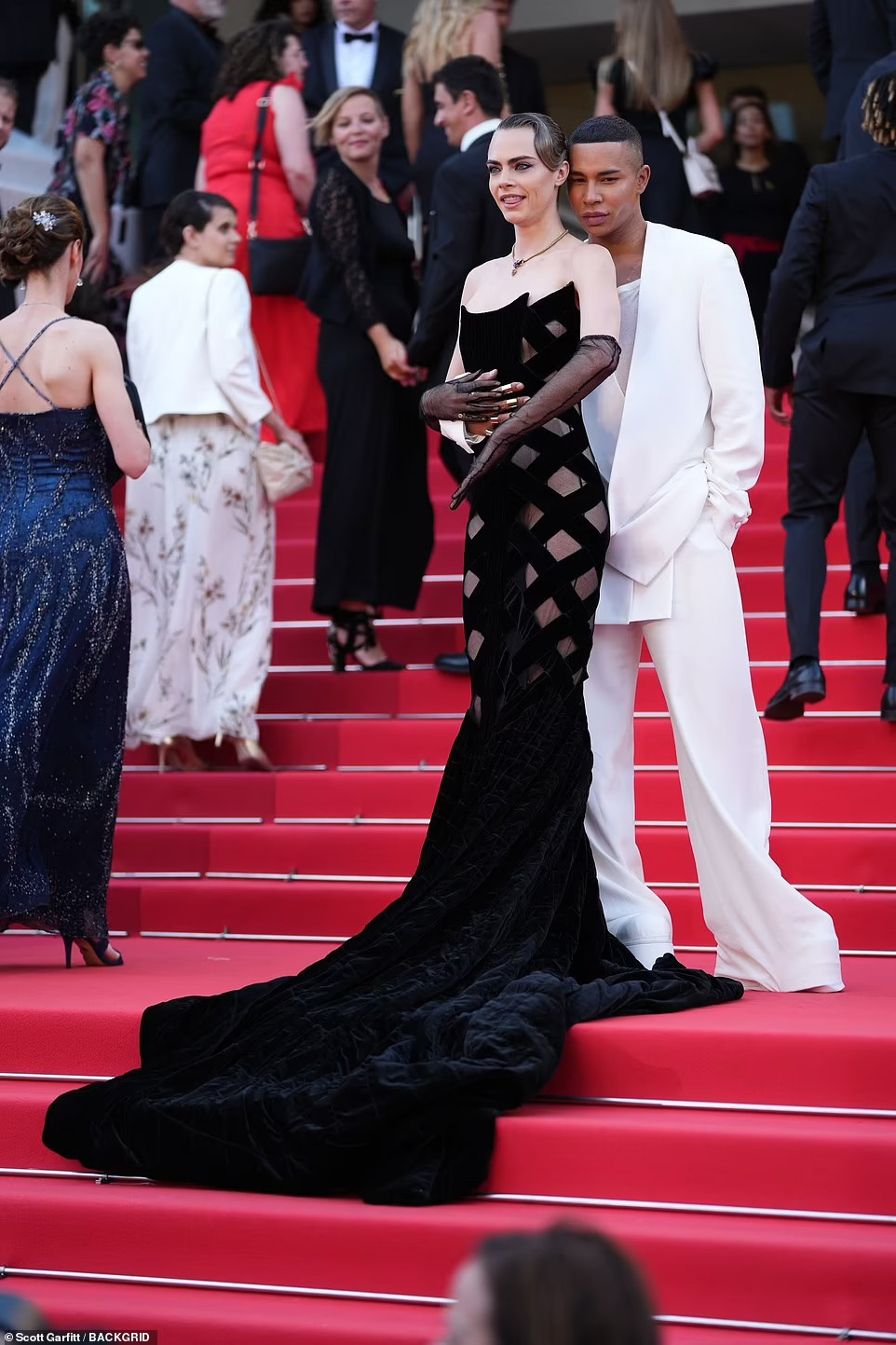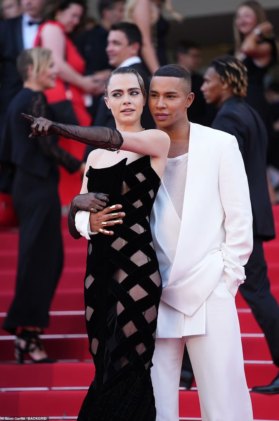 Người đẹp xuất hiện cùng Olivier Rousteing, nhà thiết kế của thương hiệu Balmain. Anh chọn cả cây trắng khi đi cùng Cara Delevingne.