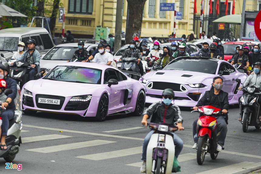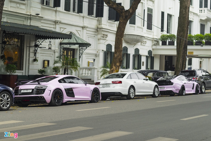 Tiếp theo là cặp đôi Audi R8 và Ford Mustang GT 5.0. Điểm thu hút của 2 xe là ngoại thất màu hồng phấn. Việc đổi màu 2 mẫu xe này được thực hiện bằng phương pháp dán decal. Cả 2 xe đều được thay đổi hệ thống ống xả, cho ra âm thanh uy lực hơn. |