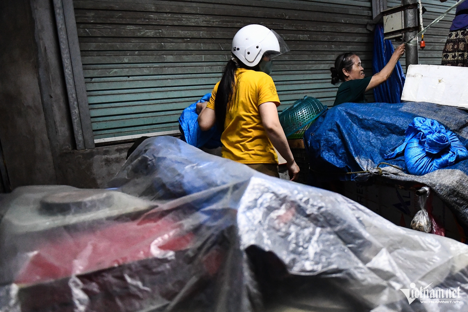 19h, các tiểu thương cũng rục rịch nghỉ chợ. Quầy hàng được che chắn, phủ bạt hoặc cố định bằng dây thừng để phòng mưa gió.