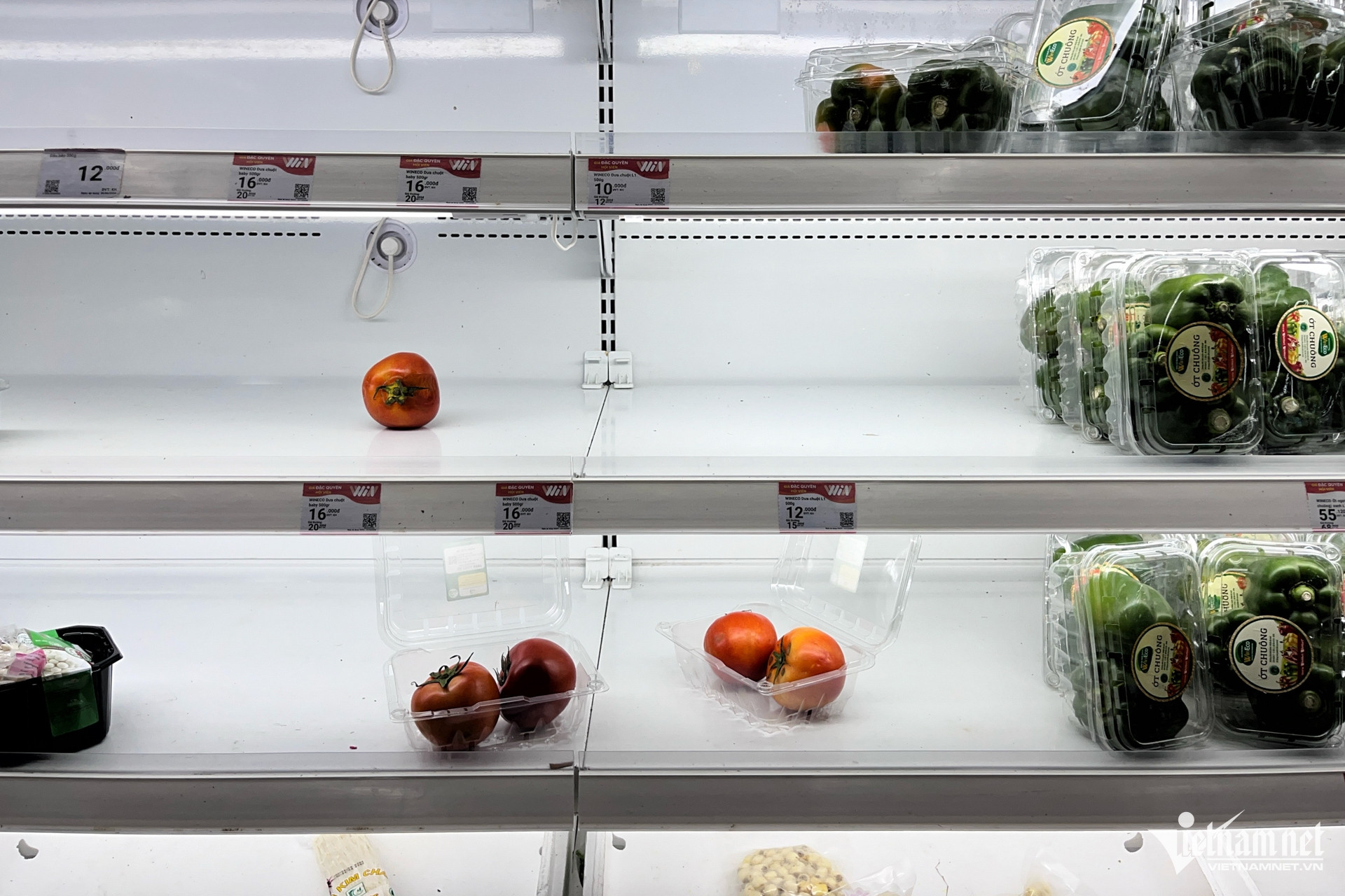 Các kệ rau trống trơn, chỉ còn lại số ít các rau củ bị hư hỏng, chất lượng thấp.