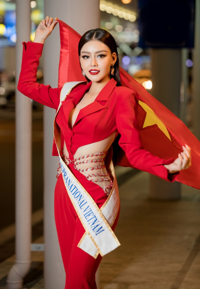 Tối 25/6, Đặng Thanh Ngân có mặt ở sân bay quốc tế Tân Sơn Nhất, TP.HCM. Đại diện Việt Nam gây chú ý khi diện bộ vest đỏ với những đường cut-out khoe eo thon, ba vòng quyến rũ của nhà thiết kế Thượng Gia Kỳ.