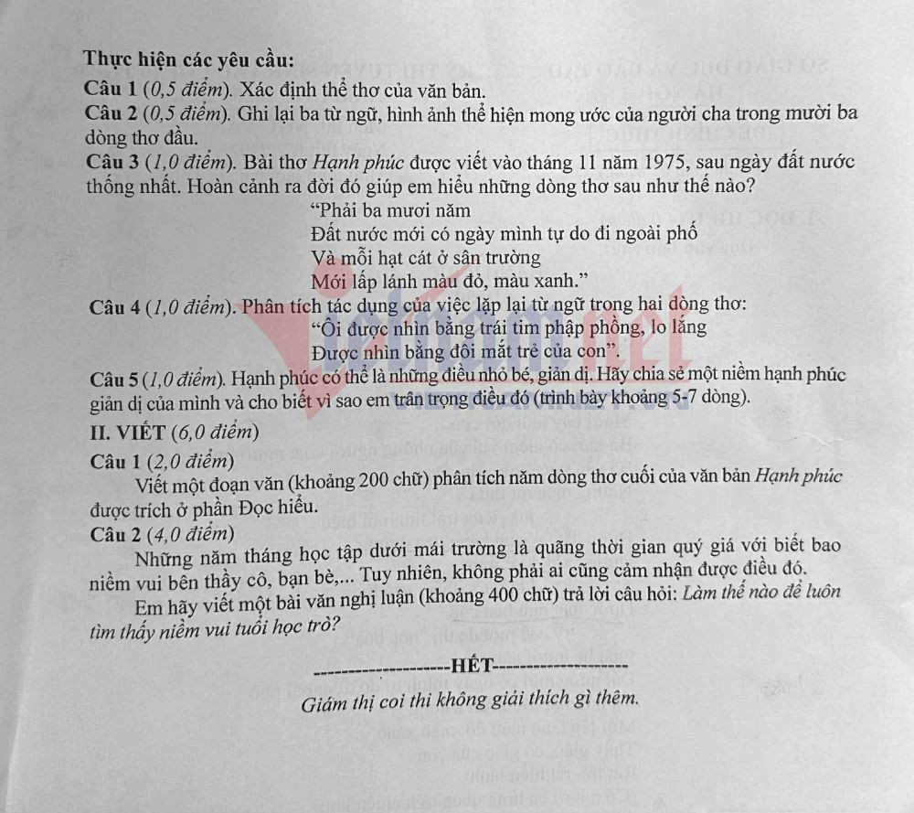 Cụ thể, phần I (Đọc hiểu) với ngữ liệu một bài thơ tự do, dù không nằm trong SGK nhưng nội dung gần gũi, xúc động về tình cảm của cha dành cho con, về niềm hạnh phúc giản dị. Các câu hỏi vừa sức, không làm khó học sinh.