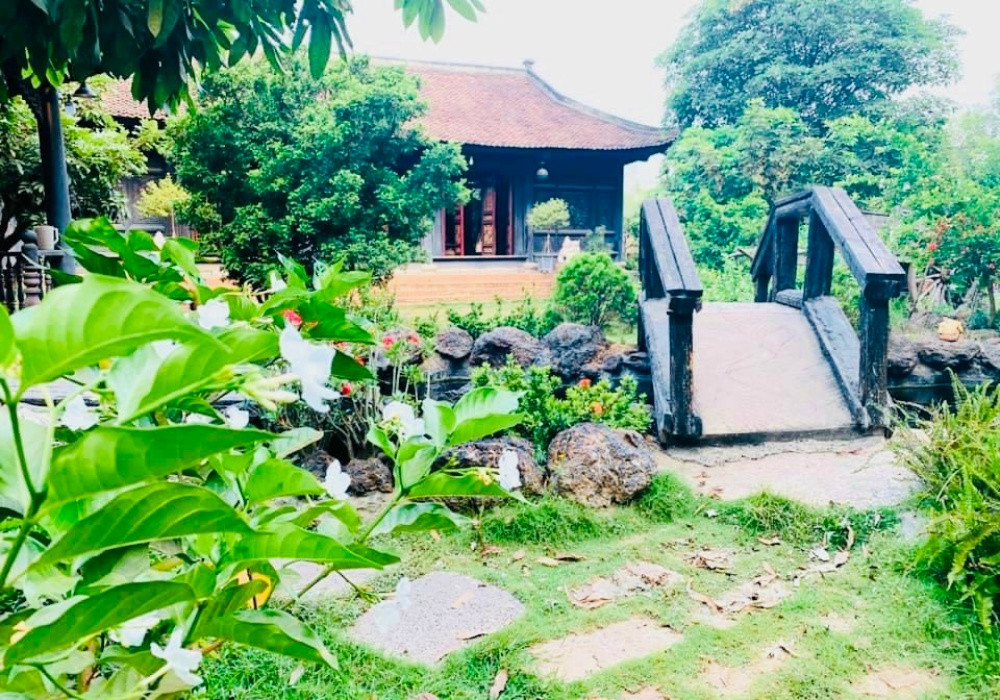 Bên cạnh hồ cá rộng, Hoàng Mập cho tạo thêm các hòn non bộ, tiểu cảnh trang trí với thác nước, cây xanh và cầu gỗ bắt qua 2 bên hồ. Mỗi lần về quê, anh dành nhiều thời gian để ngắm cá, thả hồn mình để tận hưởng không gian yên bình.