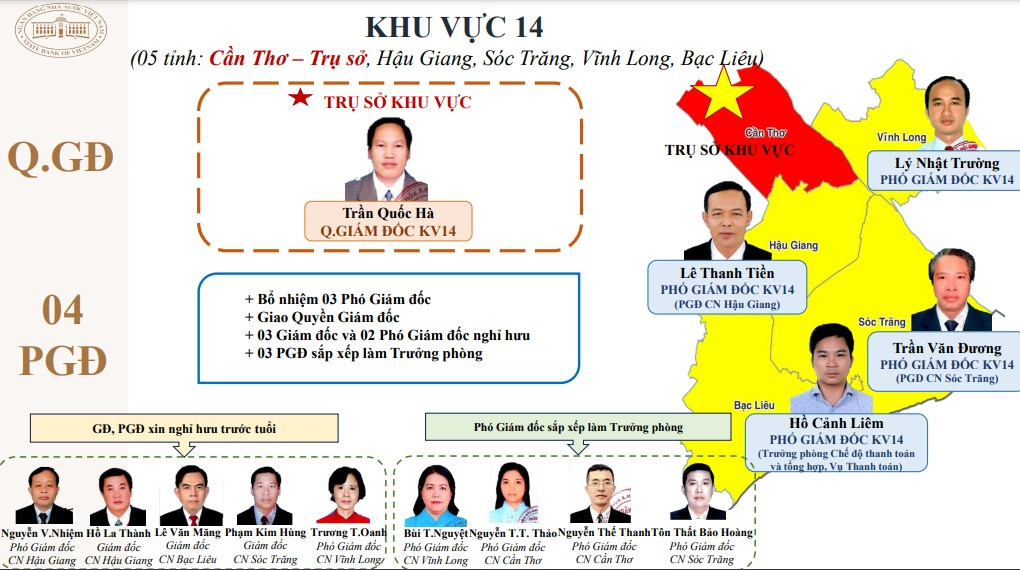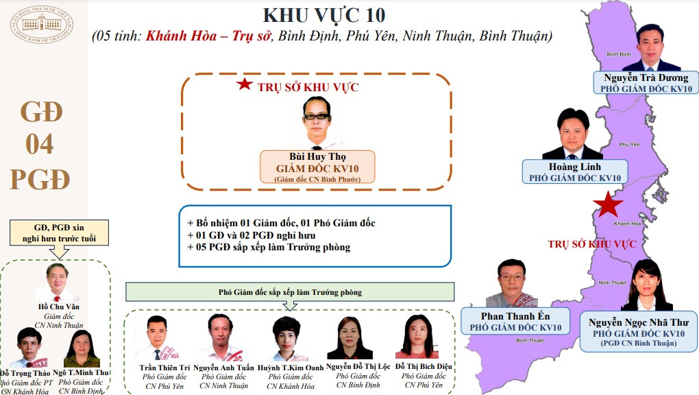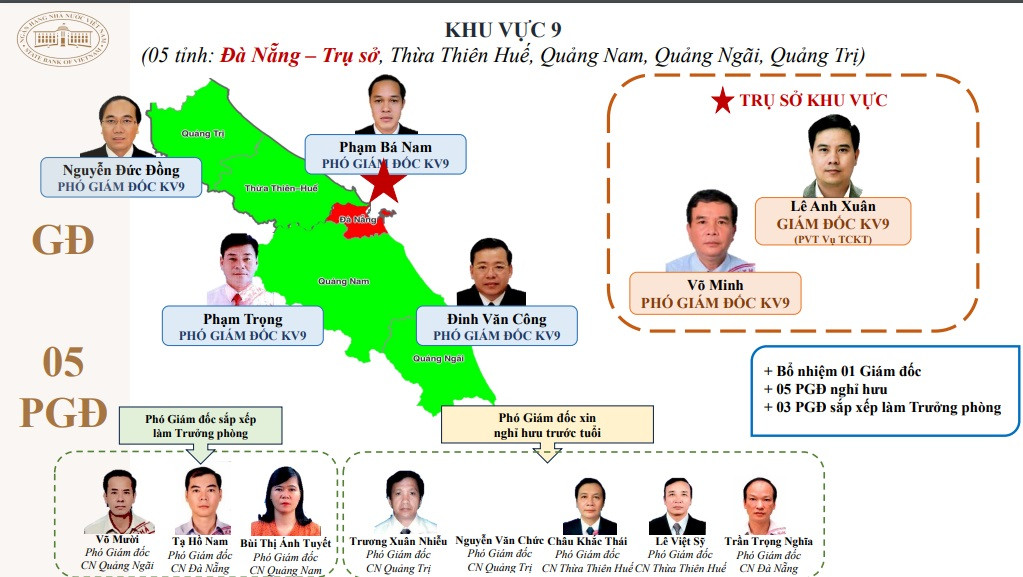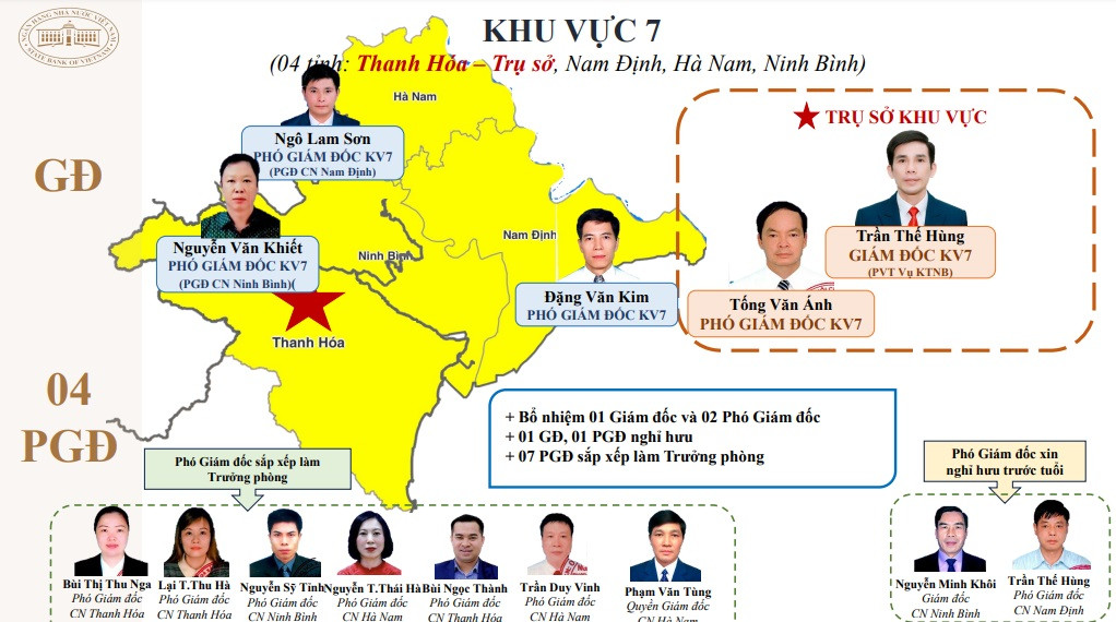 Thực hiện quy trình điều động bổ nhiệm lãnh đạo khu vực, từ 172 lãnh đạo các chi nhánh nay chỉ còn 78 lãnh đạo khu vực, giảm 94 vị trí lãnh đạo. NHNN đã bổ nhiệm 8 giám đốc, giao quyền giám đốc cho 7 phó giám đốc; điều động, bổ nhiệm 63 phó giám đốc.