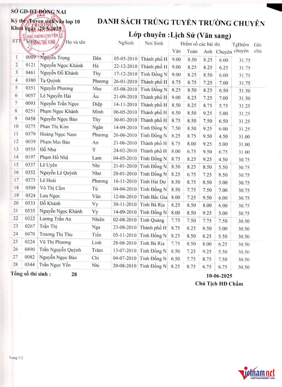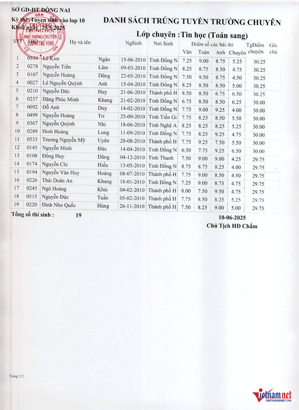 Ngày 11/6, Trường THPT Chuyên Lương Thế Vinh công bố danh sách thí sinh trúng tuyển vào lớp 10 năm học 2025-2026. Đây là trường chuyên duy nhất của tỉnh, quy tụ những học sinh xuất sắc từ các địa phương.