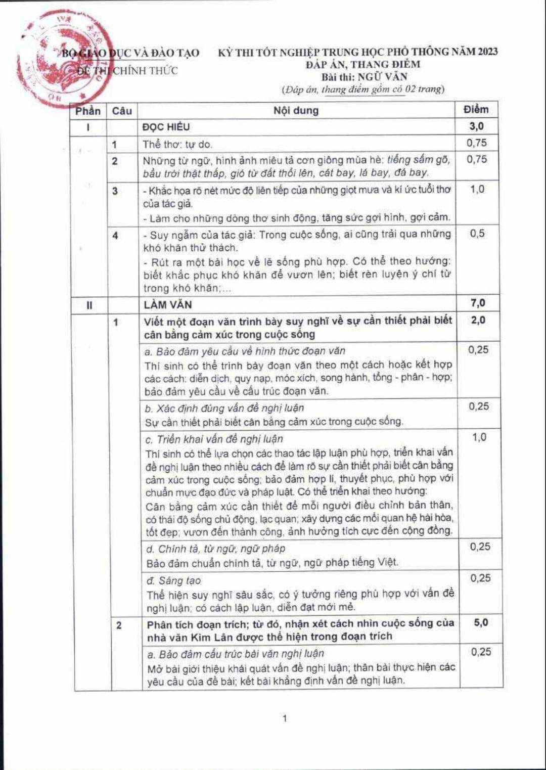 Sau đây là đáp án chính thức môn Ngữ văn thi tốt nghiệp THPT 2023: