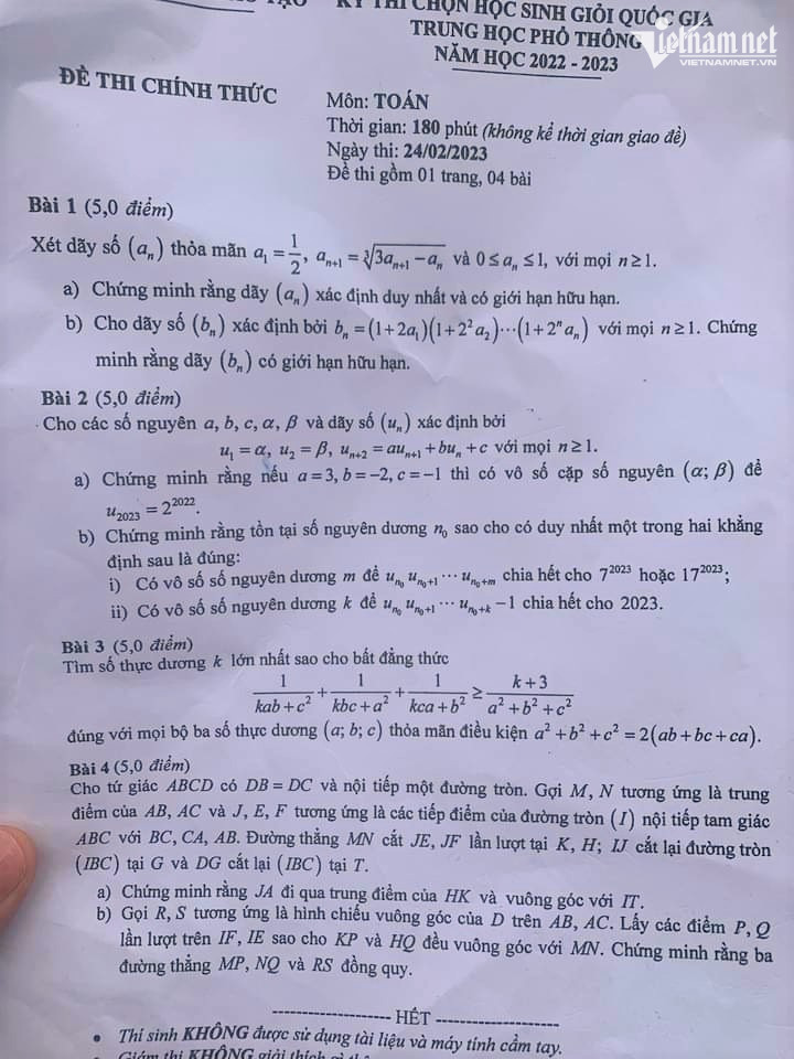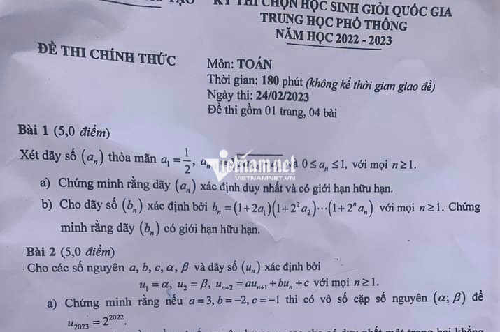 VietNamNet xin giới thiệu lời giải đề thi học sinh giỏi Toán quốc gia năm học 2022 - 2023 để độc giả và các em học sinh tham khảo: