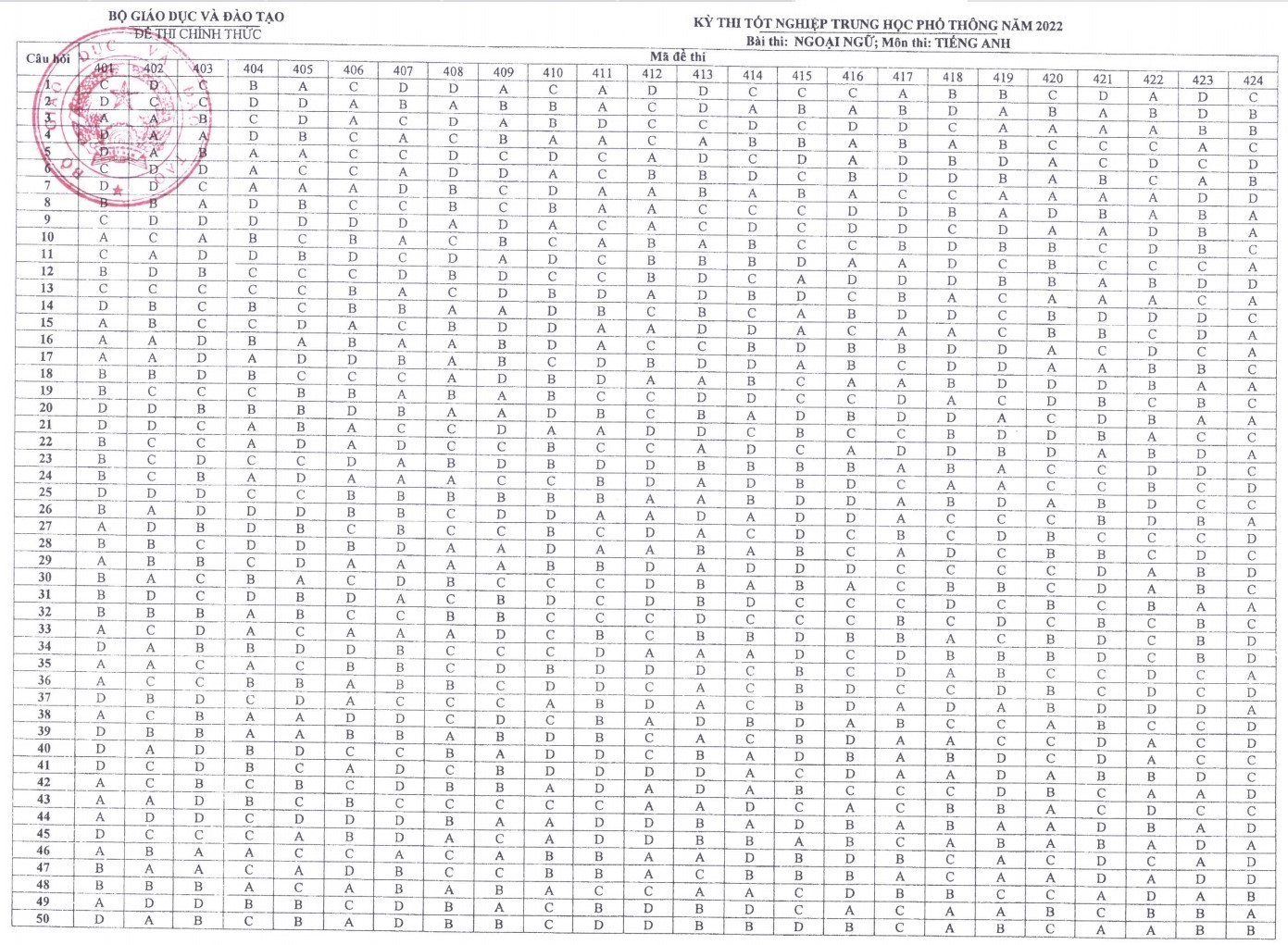 Dưới đây là đáp án môn Tiếng Anh chính thức của kỳ thi tốt nghiệp THPT năm 2022 do Bộ GD-ĐT cung cấp: