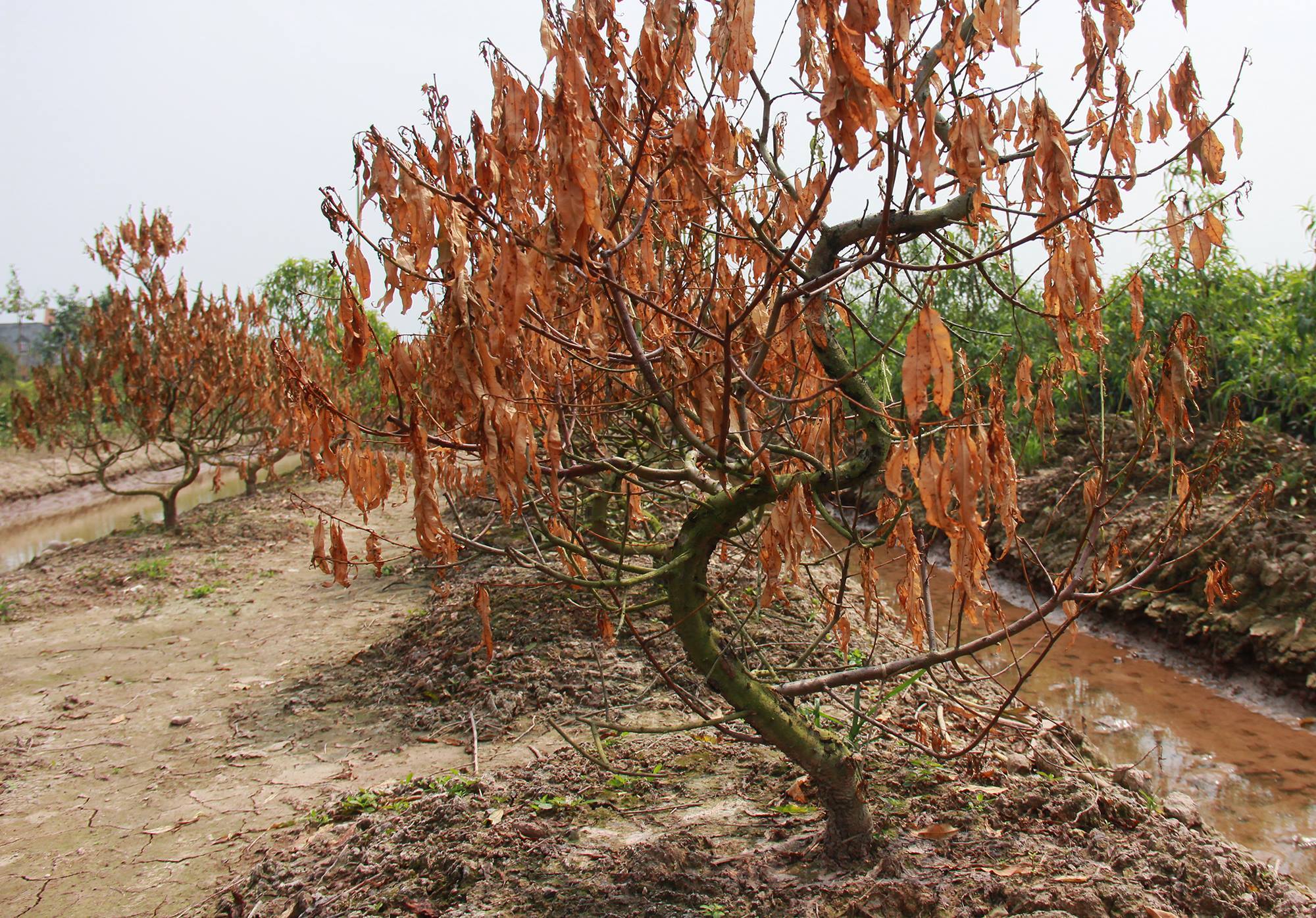 Theo ông Đạt, nguyên nhân đào chết hàng loạt là do đợt mưa lớn cộng với ngập lụt kéo dài thời gian qua, đào không thích ứng được.