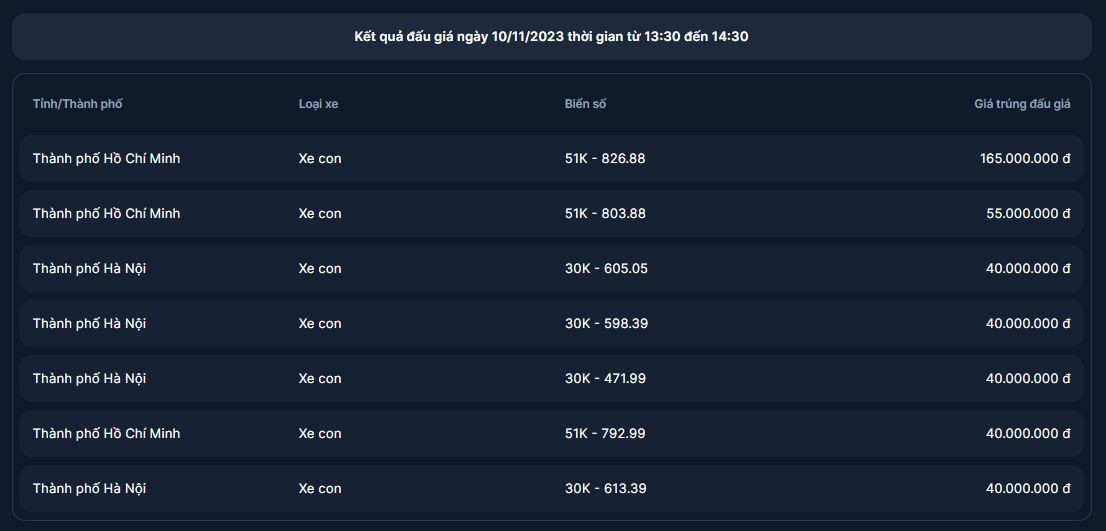 Khung giờ đấu giá cuối cùng của phiên ngày 10/11 kết thúc với mức giá trúng cũng rất thấp, dao động từ 40 - 110 triệu đồng. Cụ thể, biển số 51K - 962.99 (TP.HCM) và biển 60K - 358.58 (Đồng Nai) chốt giá cao nhất đồng mức 110 triệu đồng. Còn lại, đại đa số các biển đều đạt giá 40 triệu đồng.