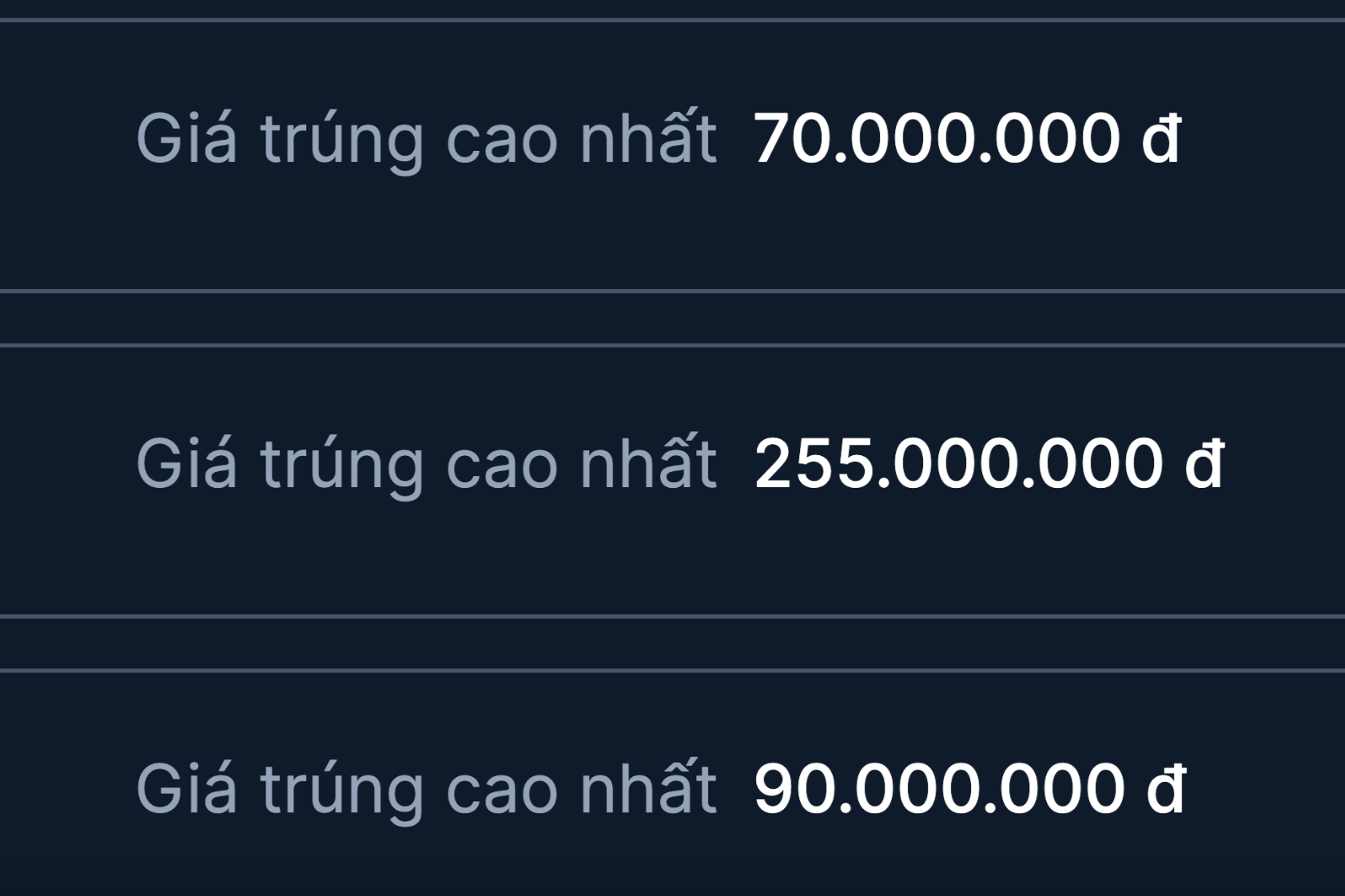 Khung giờ cuối cùng 15h-16h chiều nay cũng tương tự, rất nhiều biển số đẹp có giá thấp nhất 40 triệu đồng hoặc chênh nhau theo bước giá 5 triệu đồng, phổ biến như 51K - 777.74, 19A - 555.53, 43A - 777.33, 72A - 727.77, 17A - 387.89.