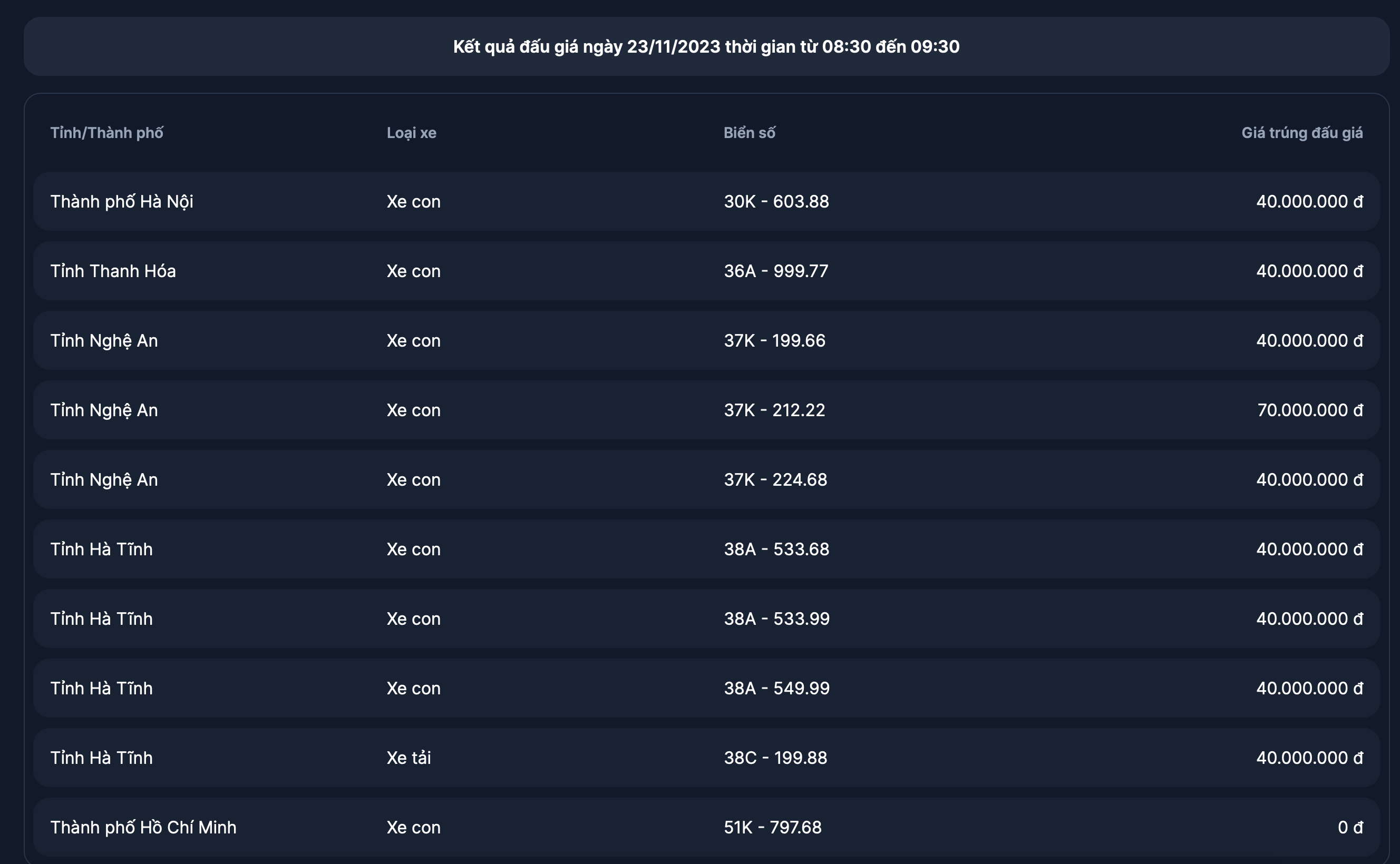 Ngoài hai biển số trên có giá cao, tất cả các biển trúng đấu giá khác đều có giá rẻ, chỉ từ 40-70 triệu đồng. Đáng chú ý, có hai biển số đuôi lộc phát, tam hoa khá đẹp như 51K - 915.55 và 51K - 797.68 của TP.HCM không xác định được người đấu trúng, sẽ trả về kho số bấm ngẫu nhiên.