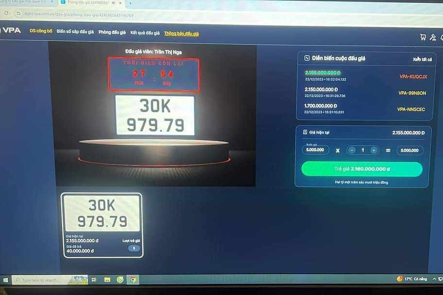 Phiên đấu giá biển số ô tô sáng ngày 23/12 khá sôi động khi có nhiều biển số ngũ quý, đuôi tứ quý so kè nhau. Theo danh sách kết quả được công bố, có mức giá chốt cao thứ ba, đứng sau hai biển số đẹp trên là biển ngũ quý 6 của Lâm Đồng trúng giá 3,7 tỷ đồng.
