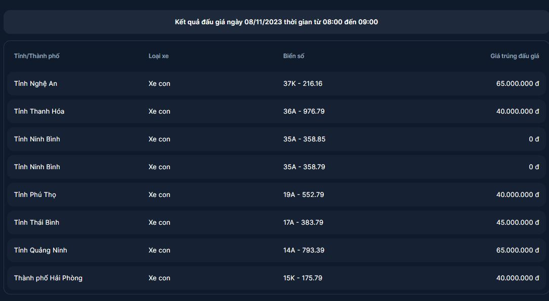 Kết quả đấu giá biển số khung giờ từ 8h00-9h00.