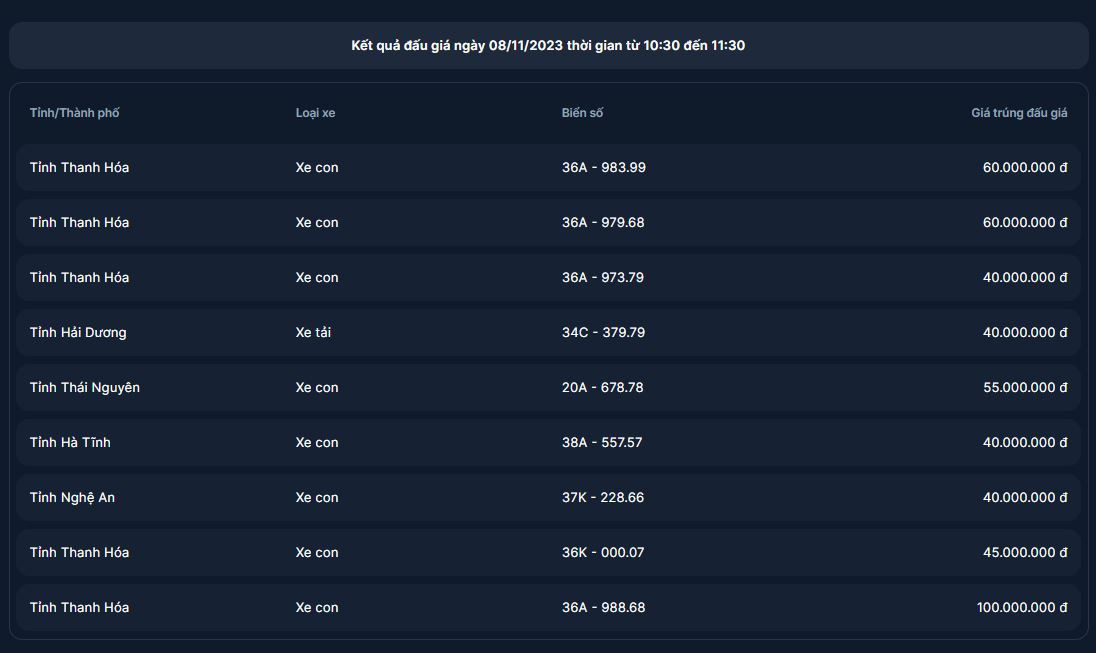 Kết quả đấu giá biển số khung giờ từ 10h30-11h30..