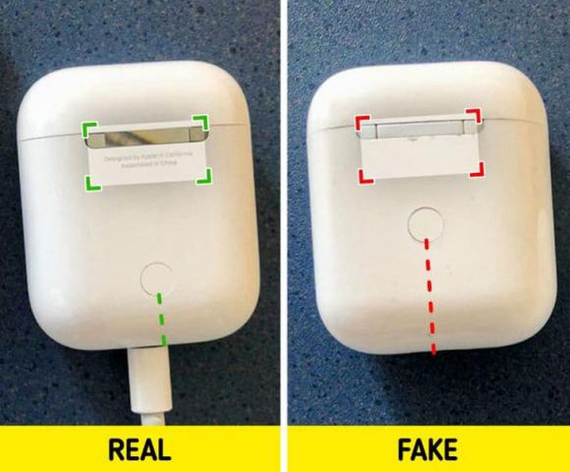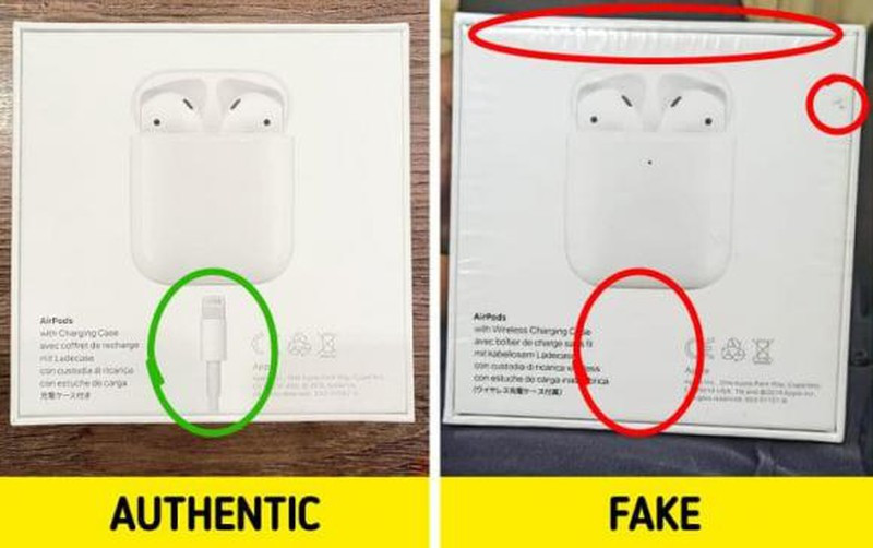 Khi mua AirPods, bạn có thể xác định xem chúng có phải là nguyên bản hay không trước khi mở chúng ra. Trên một sản phẩm giả, nút quay lại sẽ cao hơn nhiều so với trên hộp chính hãng. Ngoài ra, hộp đựng xác thực sẽ có chú thích ban đầu mà tất cả các sản phẩm của Apple đều có.