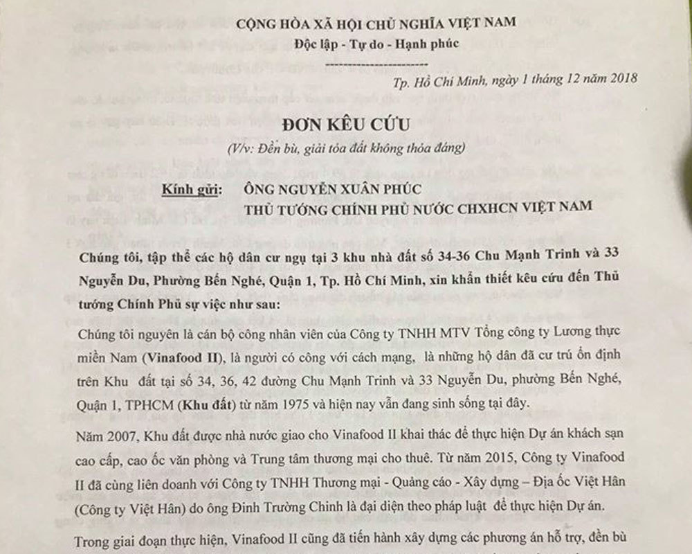 | Các hộ dân sinh sống trên "đất vàng" khiếu kiện tập thể, kêu cứu tới Thủ tướng Chính phủ và mong muốn cơ quan điều tra vào cuộc, làm rõ vụ "xẻ thịt" công sản diễn ra ngay tại trung tâm Sài Gòn |