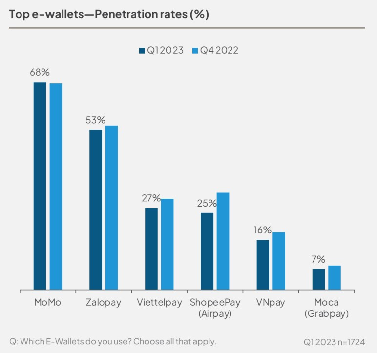 Đáng chú ý, báo cáo của Decision Lab cũng cung cấp nhiều thông tin quan trọng về sự phát triển của thị trường ví điện tử Việt Nam. Theo kết quả khảo sát, trong Quý 1/2023, MoMo hiện vẫn đang dẫn đầu thị trường ví điện tử khi có mức độ thâm nhập (penetration rate) lên tới 68%.