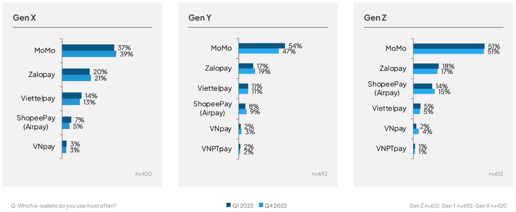 Báo cáo cũng chỉ ra MoMo là Fintech được yêu thích nhất với mức độ yêu thích 48%, tăng 2 điểm % so với quý IV/2022. Mức độ yêu thích của MoMo cũng dẫn đầu tuyệt đối ở cả ba thế hệ (Gen) X, Y và Z. Đặc biệt, startup này chiếm thế thượng phong khi có mức độ yêu thích cao hơn 50% với hai nhóm người dùng Gen Z (từ 16-25 tuổi) và Gen Y (từ 26-41 tuổi).
