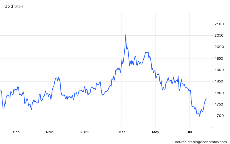 Giá vàng cũng hưởng lợi nhờ xung đột Nga - Ukraine, tuy nhiên, giá nhanh chóng sụt giảm vì USD tăng giá. Đến nay, vàng được giao dịch quanh mức 1.773 USD/ounce, giảm mạnh so với mức hơn 2.000 USD/ounce hồi tháng 3.