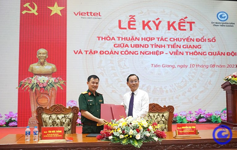 Chiều 10/8, UBND tỉnh Tiền Giang và Tập đoàn Công nghiệp - Viễn thông Quân đội (Tập đoàn Viettel) tổ chức Lễ ký kết thỏa thuận hợp tác đẩy mạnh chuyển đổi số giai đoạn 2023 - 2028.