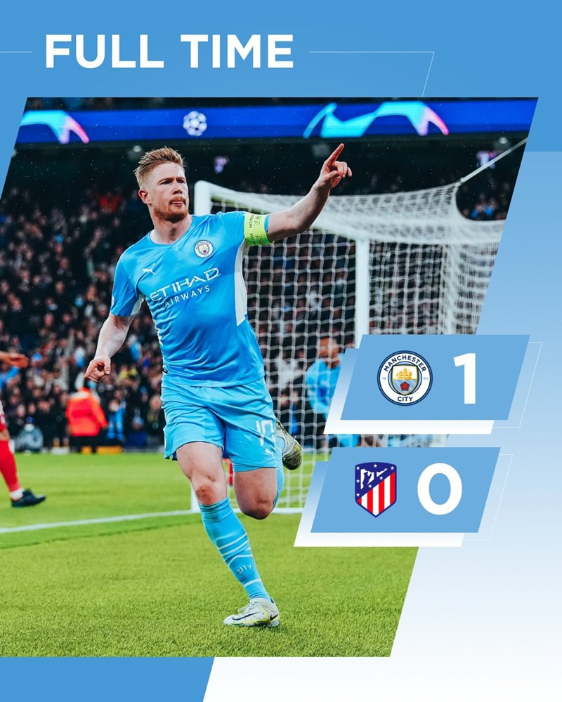Man City giành lợi thế ở tứ kết Champions League sau khi đánh bại Atletico, nhờ pha ghi bàn duy nhất của De Bruyne.