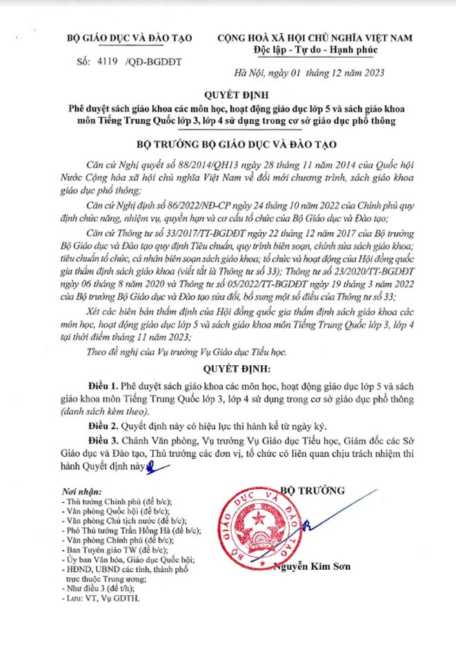 Ngày 1/12/2023, Bộ trưởng Bộ GD-ĐT ban hành Quyết định số 4119/QĐ-BGDĐT về việc phê duyệt sách giáo khoa các môn học, hoạt động giáo dục lớp 5 và sách giáo khoa tiếng Trung Quốc lớp 3, lớp 4 sử dụng trong cơ sở giáo dục phổ thông.