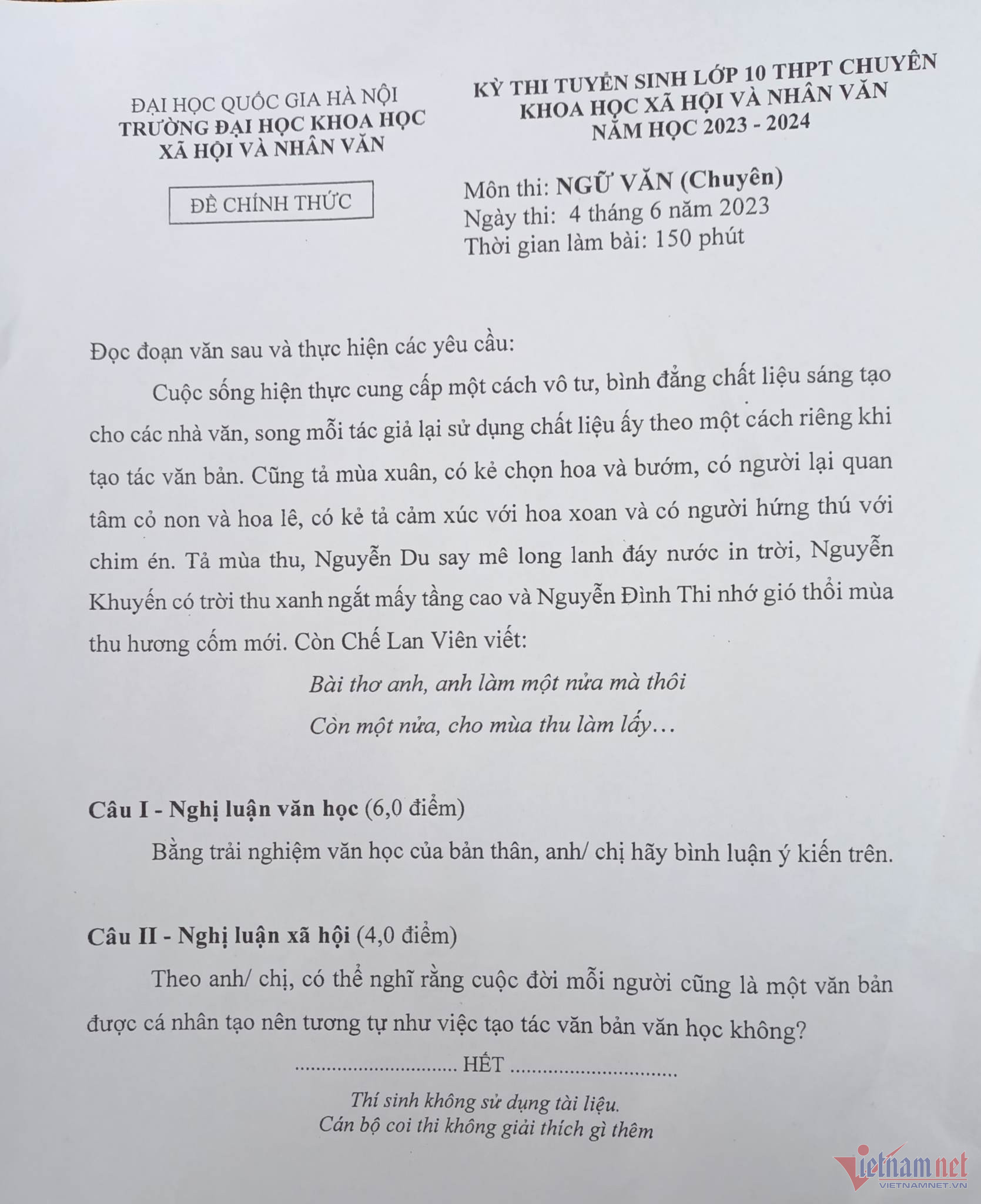 Sau đây là đề thi vào lớp 10 chuyên Văn Trường THPT Chuyên Khoa học Xã hội và Nhân văn năm 2023: