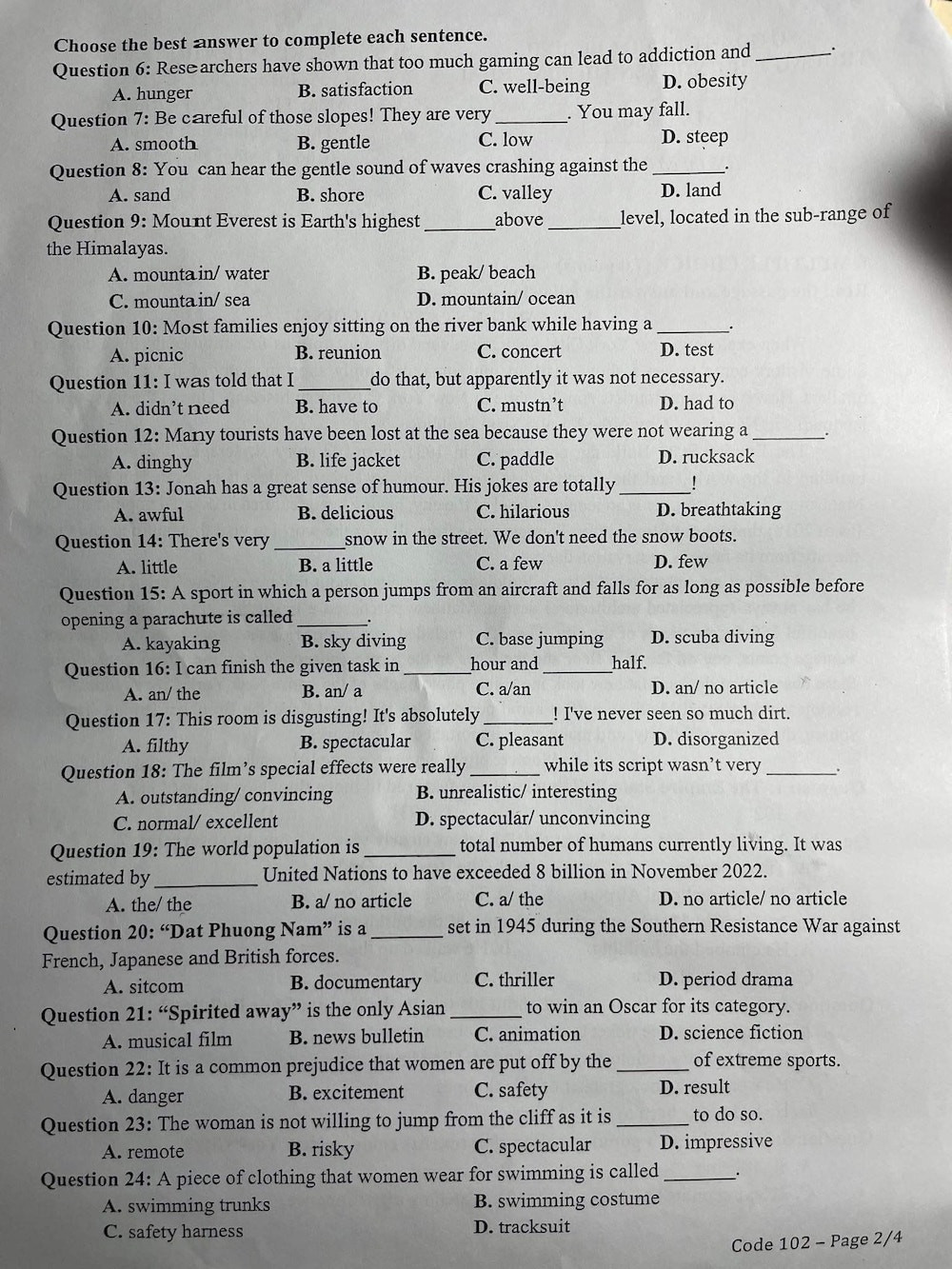 VietNamNet sẽ tiếp tục giới thiệu với bạn đọc đề thi cuối kỳ các môn Toán, Văn, Anh từ lớp 6 đến lớp 12 của các trường trên khắp cả nước.