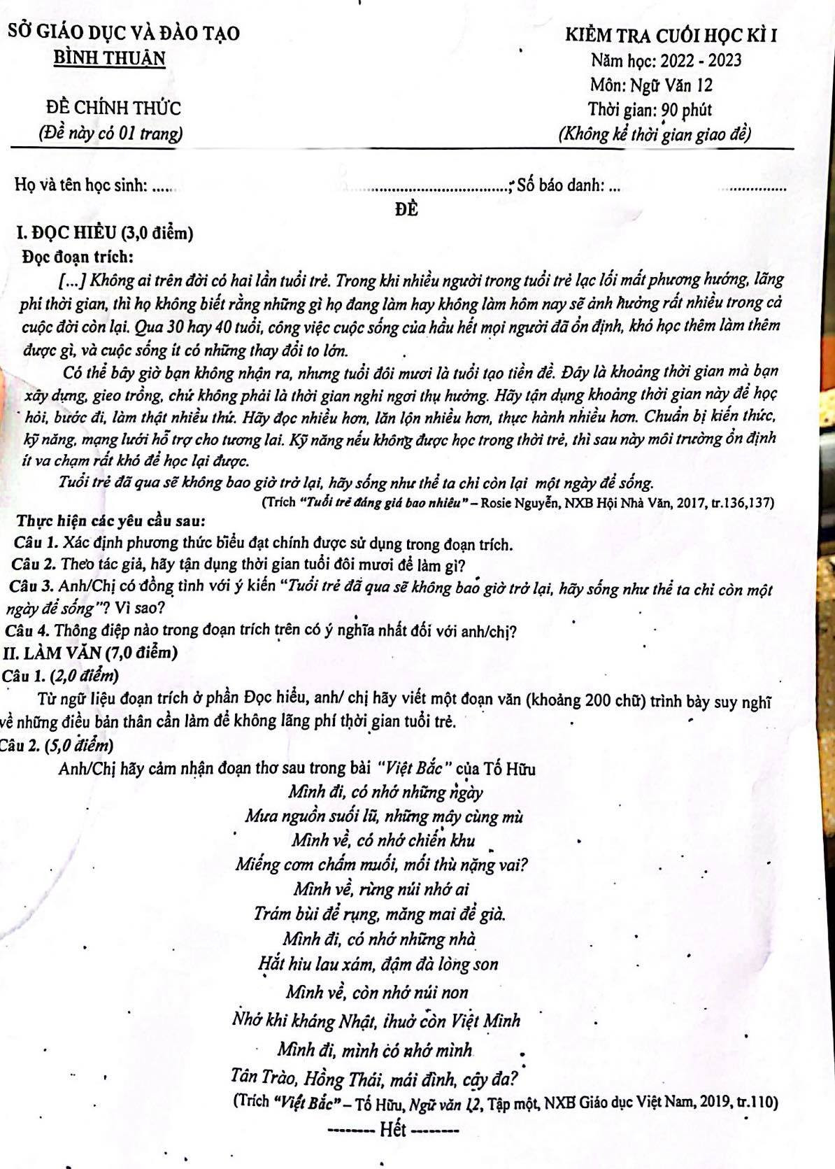 Học sinh lớp 12 của tỉnh Bình Thuận vừa thực hiện bài kiểm tra học kỳ 1 môn Ngữ văn. Đề kiểm tra có hai phần gồm Đọc hiểu (4 câu) và Làm văn (2 câu). Thời gian làm bài là 90 phút.