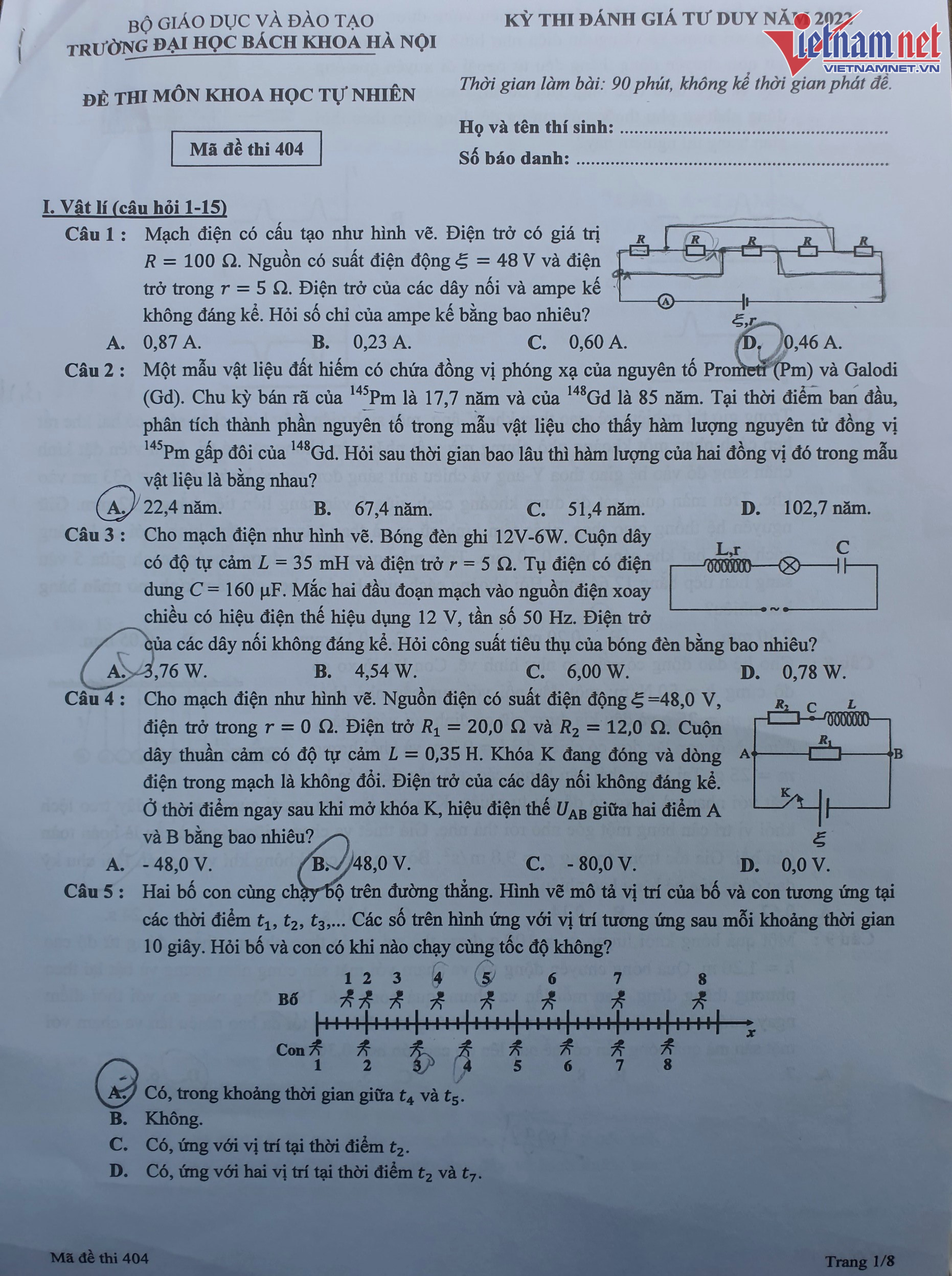 Đề thi đánh giá tư duy Trường ĐH Bách khoa Hà Nội 2022, phần Khoa học tự nhiên:
