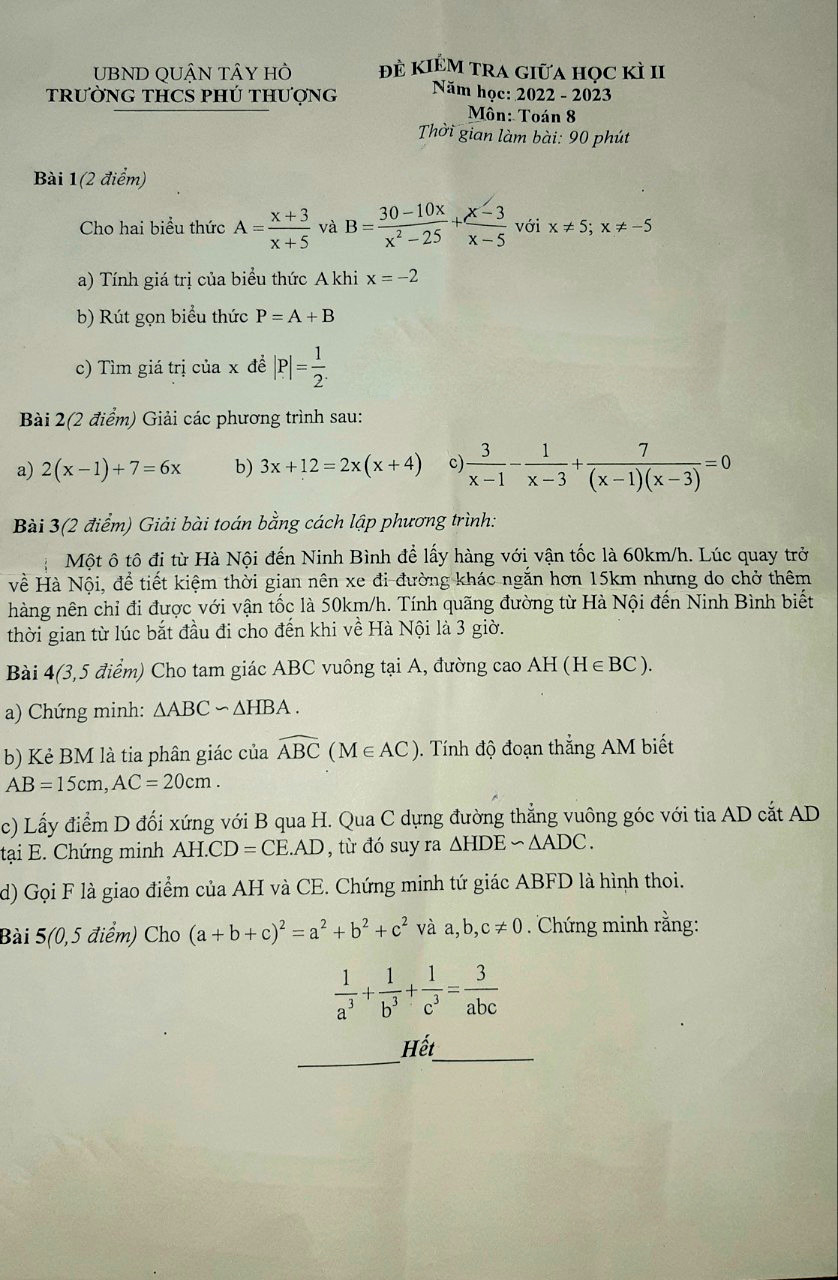 Dưới đây là đề kiểm tra môn Toán lớp 8 giữa học kì 2 năm học 2022 - 2023 của Trường THCS Phú Thượng (Tây Hồ, Hà Nội) để học sinh, phụ huynh tham khảo.