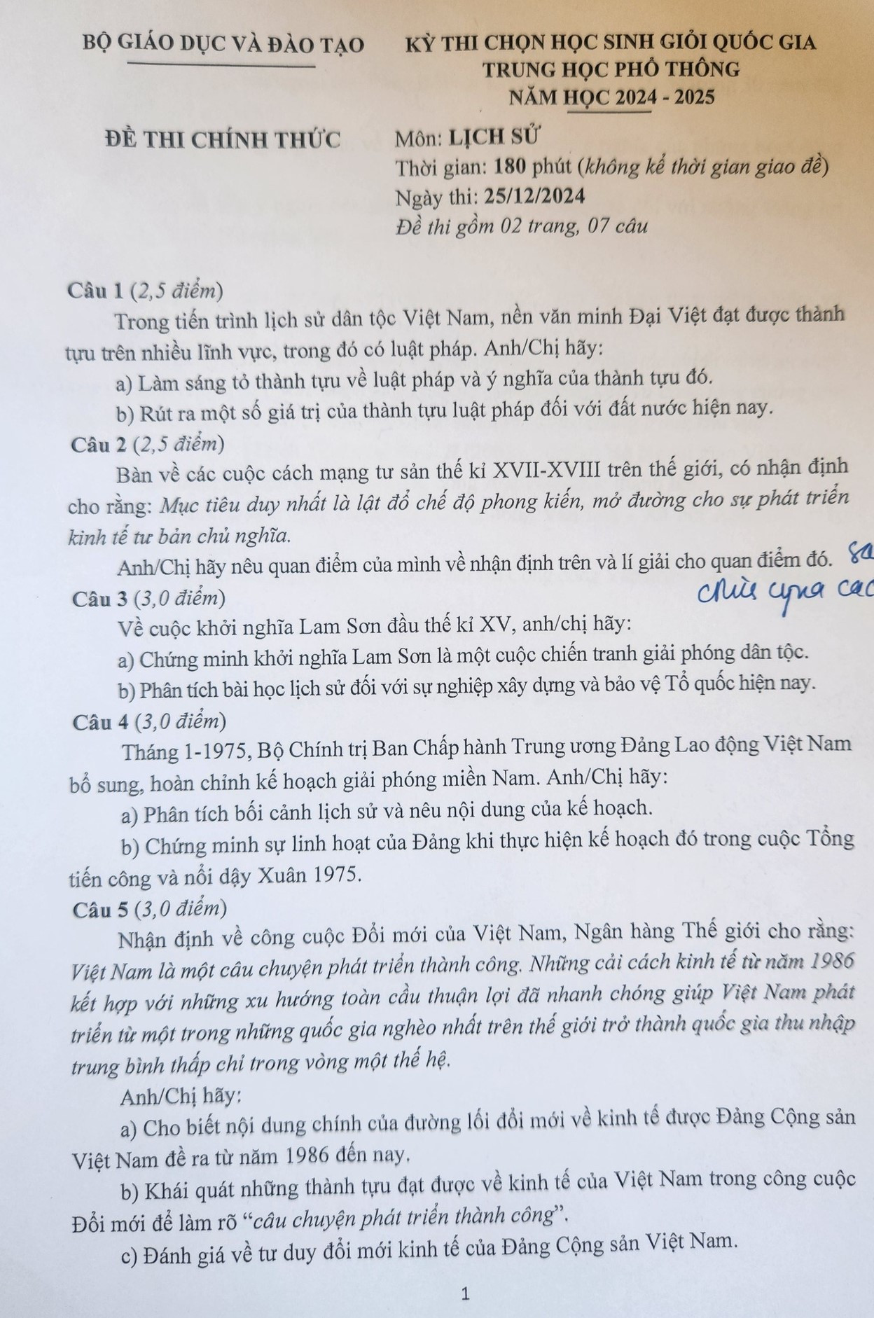 Dưới đây là đề thi chọn học sinh giỏi quốc gia THPT môn Lịch sử năm học 2024-2025: