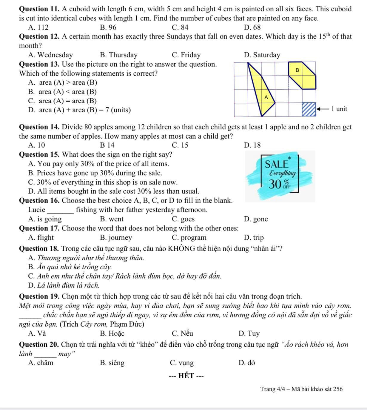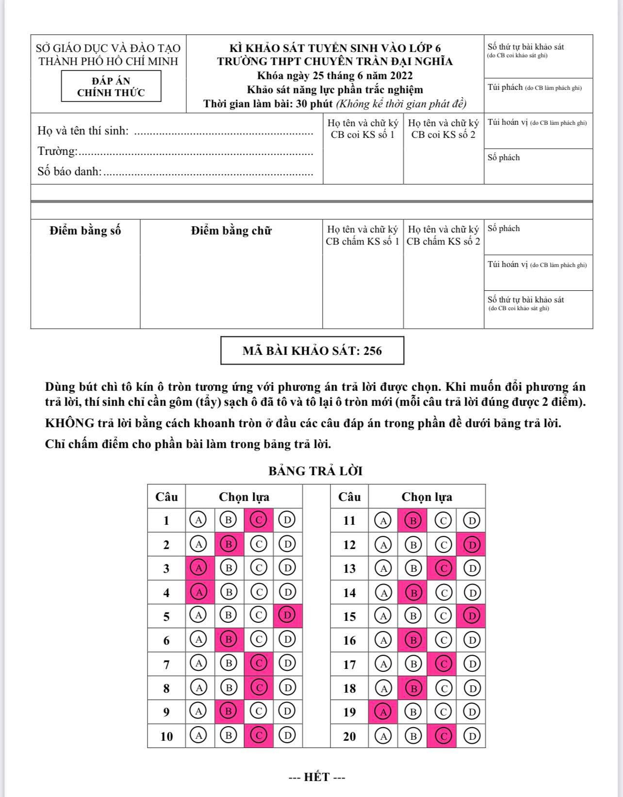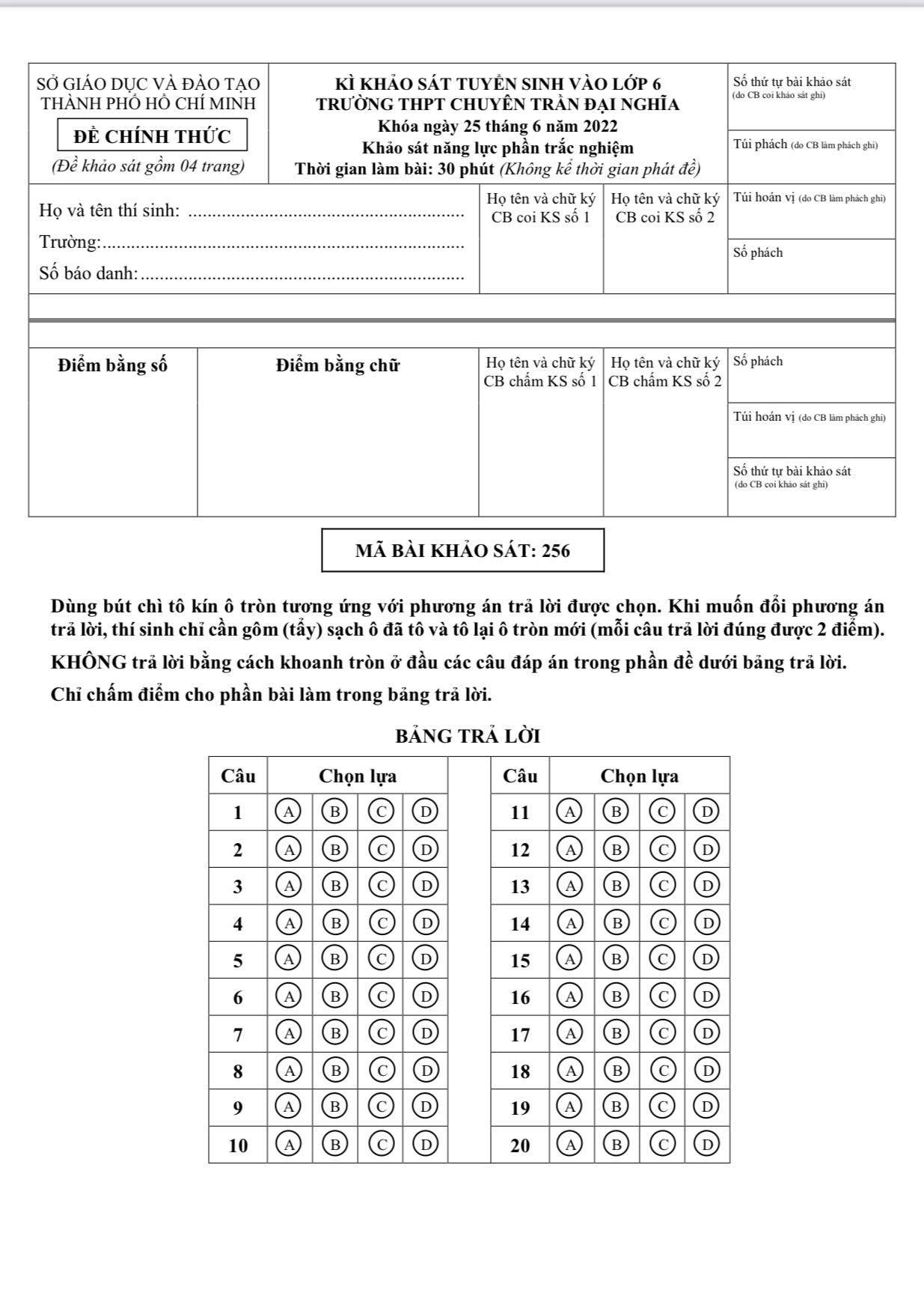 Sau đây là đề và đáp án bài khảo sát tuyển sinh vào lớp 6 Trường THPT Chuyên Trần Đại Nghĩa năm 2022
