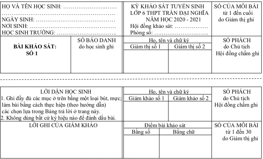 Đề và đáp án bài khảo sát tuyển sinh vào lớp 6 Trường THPT Chuyên Trần Đại Nghĩa năm 2020