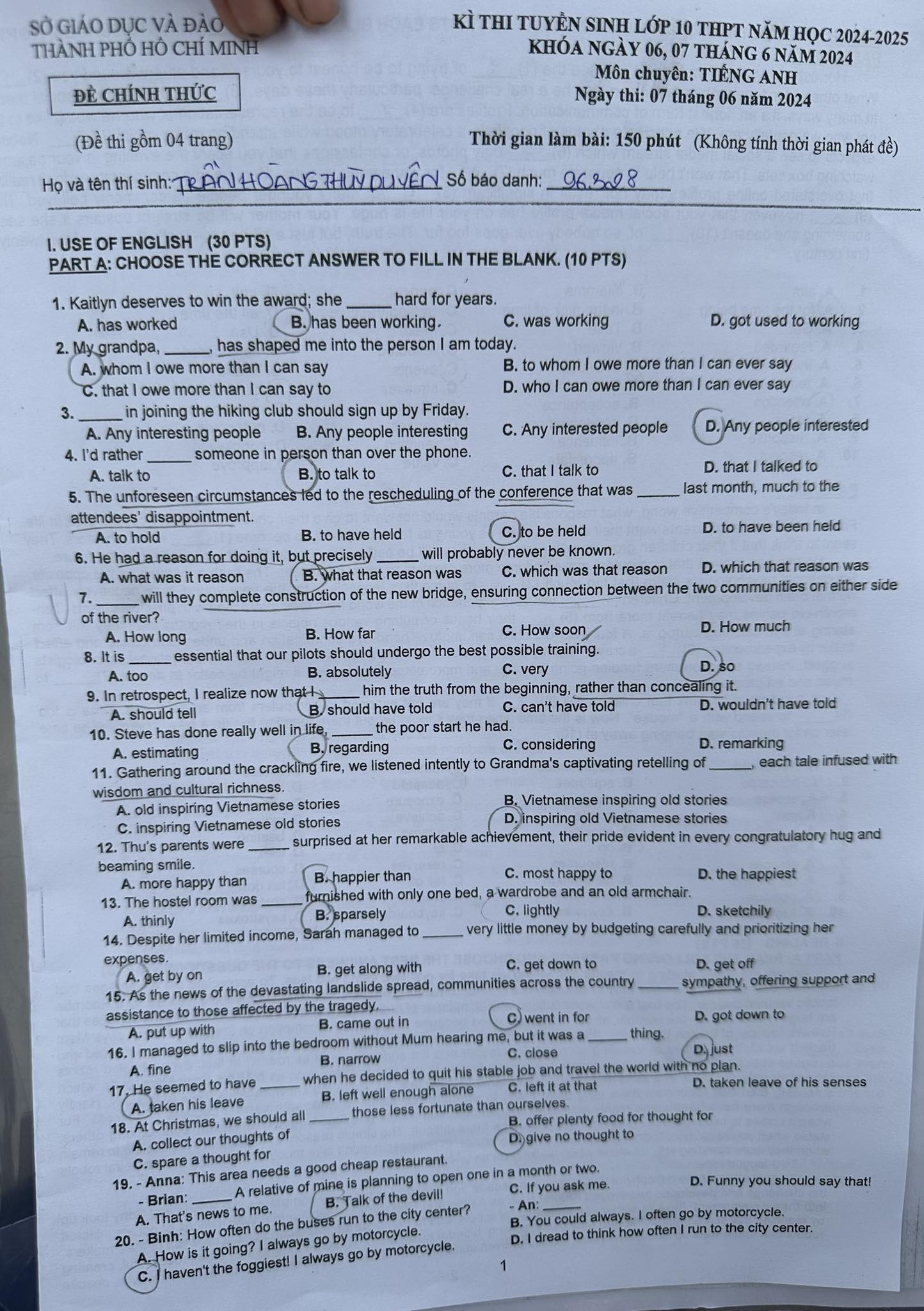 Đáp án gợi ý môn tiếng Anh thi lớp 10 Hà Nội năm 2024