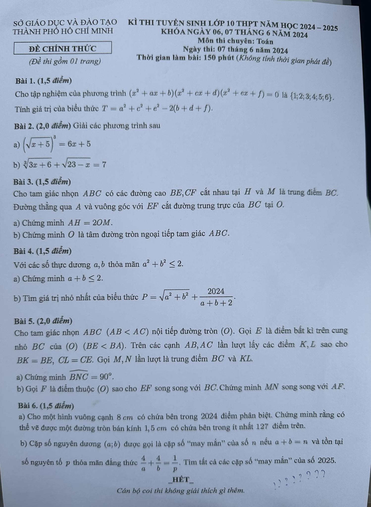 Đáp án chính thức môn Toán thi lớp 10 ở TPHCM năm 2024