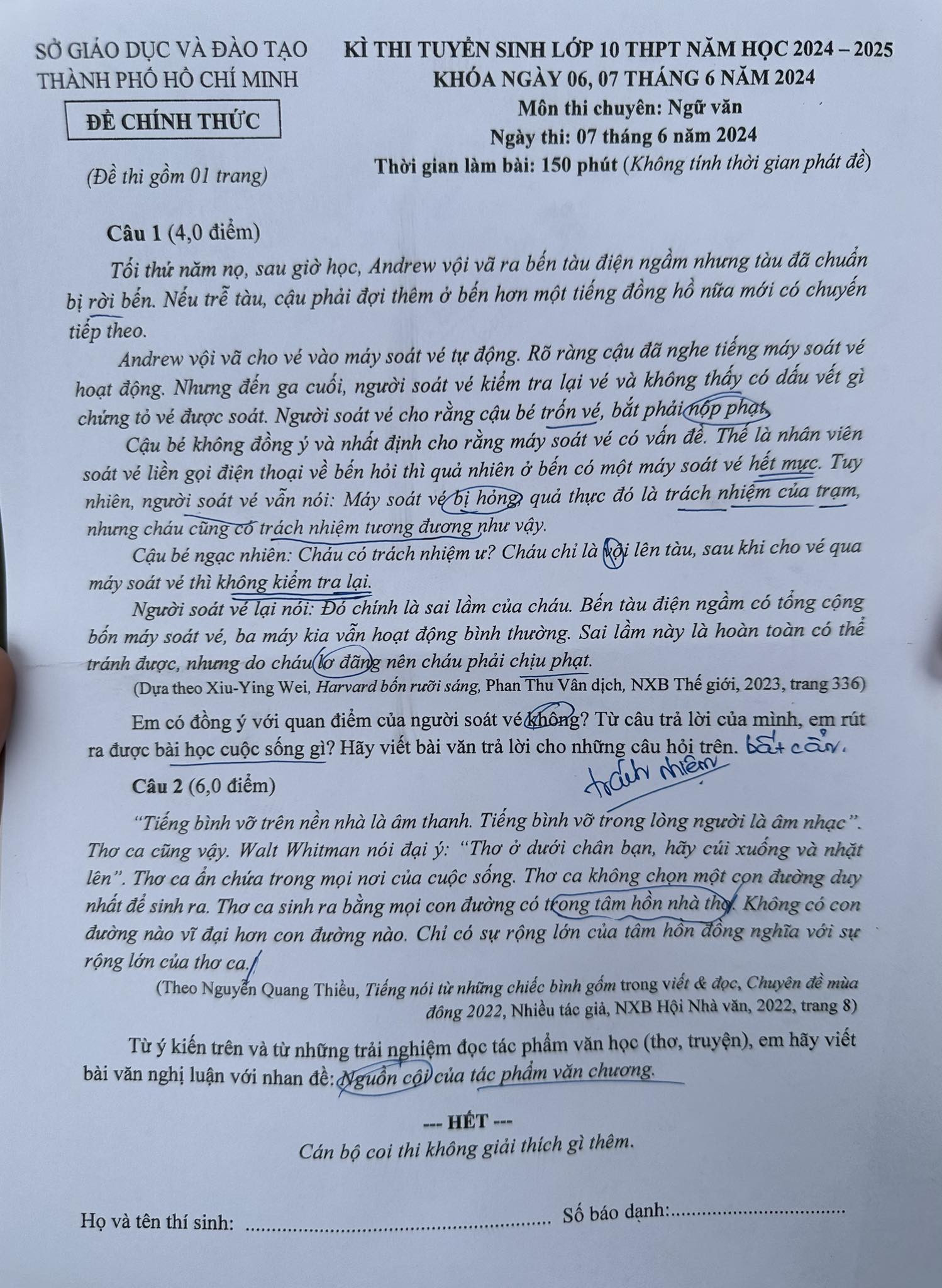 Đáp án chính thức môn Ngữ văn thi lớp 10 ở TPHCM năm 2024