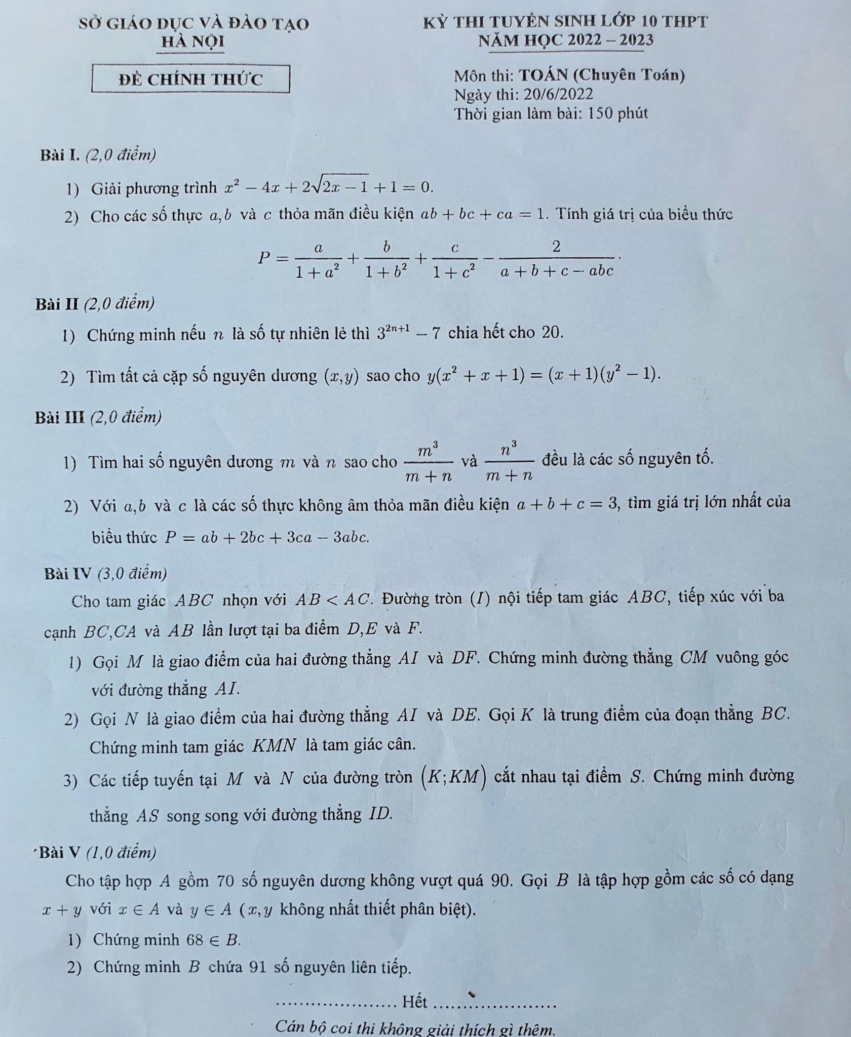Đề thi vào lớp 10 chuyên Toán của Hà Nội năm 2022