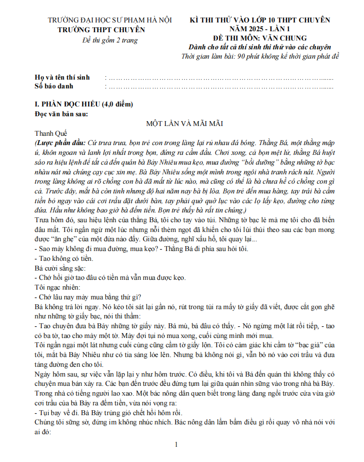 Đề thi thử lớp 10 môn Văn do Trường THPT Chuyên Sư phạm xây dựng gồm 2 phần với thời gian làm bài trong 90 phút như sau: