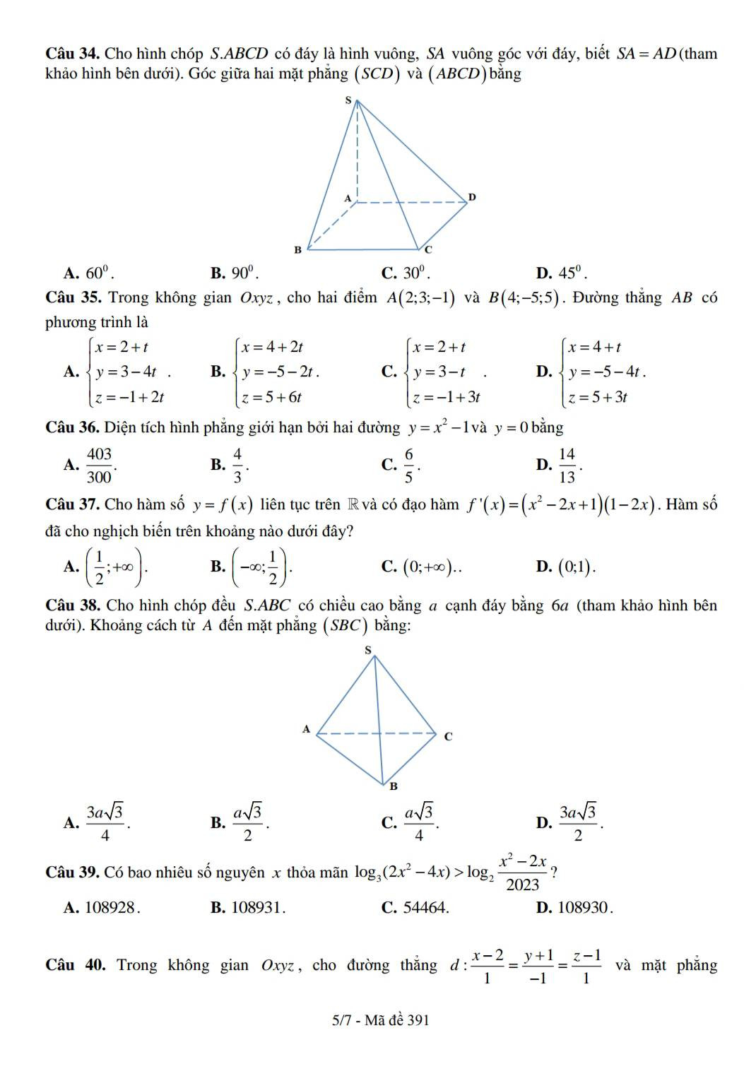 Đề thi môn Toán thi tốt nghiệp THPT 2023 chính thức