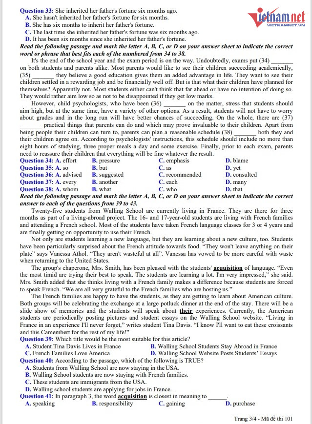 Dưới đây là một số đề thi thử tốt nghiệp THPT môn Tiếng Anh cùng đáp án được Sở GD-ĐT Vĩnh Phúc xây dựng để khảo sát chất lượng học sinh năm 2022: