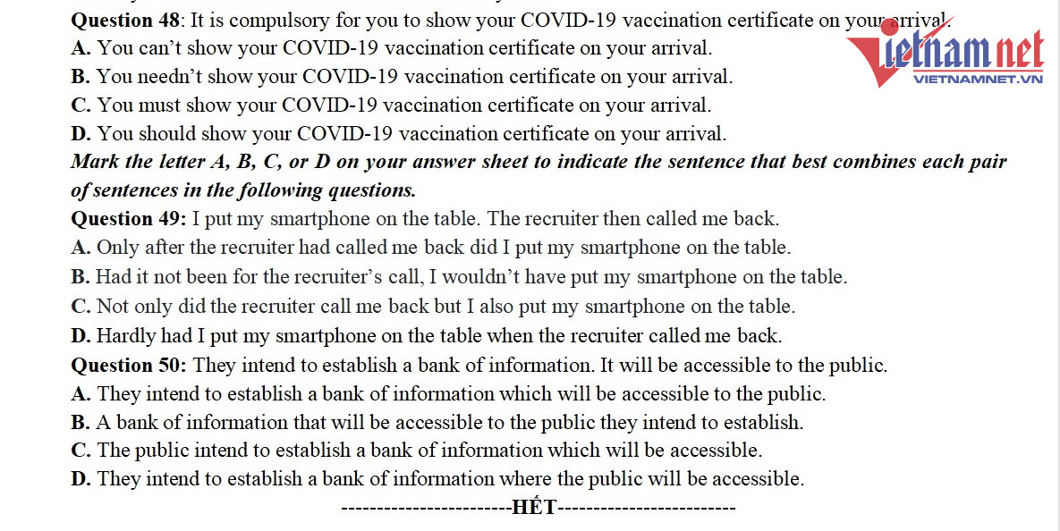 Dưới đây là đề Tiếng Anh ở kỳ thi thử tốt nghiệp THPT năm 2022 với 50 câu trong vòng 60 phút mà Trường THPT Chuyên Đại học Vinh xây dựng: