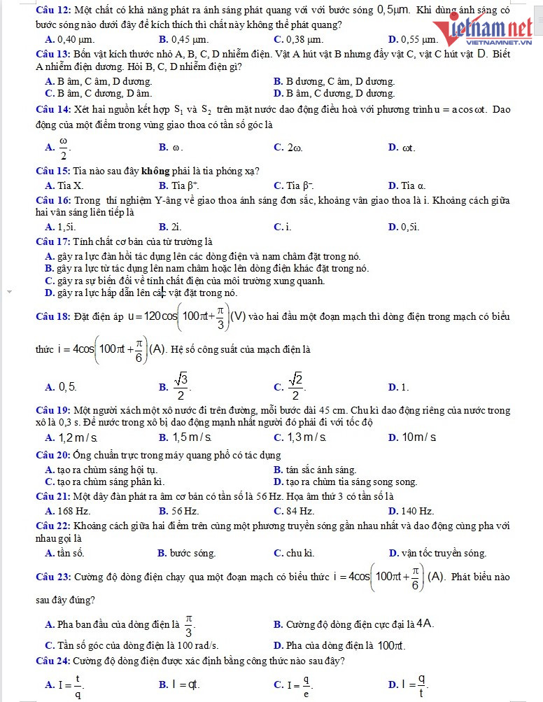 Dưới đây là đề thi thử tốt nghiệp THPT môn Vật lý cùng đáp án được Sở GD-ĐT Vĩnh Phúc xây dựng để khảo sát chất lượng học sinh năm 2022: